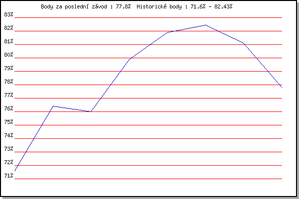Závod| Body | Výkonnost | Změna | 20.05.2015 | Palackého vrch, 7.1 km | 71.60% | 71.60% | | 27.05.2015 | Obřany, 8.8 km | 76.39% | 74.96% | +3.36% | 10.06.2015 | Popůvky, 7.9 km | 76.01% | 75.84% | +0.88% | 17.06.2015 | Pisárky Anthropos, 6 km | 79.89% | 77.78% | +1.94% | 01.07.2015 | Obřany, 8.8 km | 81.87% | 79.45% | +1.67% | 08.07.2015 | Popůvky, 7.9 km | 82.43% | 80.70% | +1.25% | 15.07.2015 | Atletický stadión Pod Palackého vrche | 81.12% | 81.10% | +0.40% | 16.09.2015 | Pisárky Anthropos, 6 km | 77.80% | 80.39% | -0.71% | | |