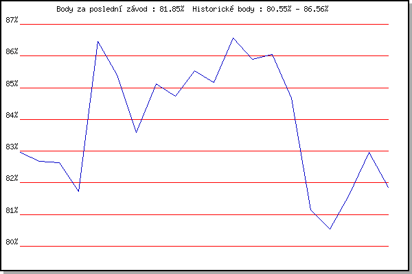 ZávodBodyVýkonnostZměna| 13.05.2015 | Pisárky Anthropos, 6 km | 82.95% | 82.95% | | | 20.05.2015 | Palackého vrch, 7.1 km | 82.69% | 82.84% | -0.11% | | 27.05.2015 | Obřany, 8.8 km | 82.63% | 82.76% | -0.08% | | 03.06.2015 | Líšeň, 11 km | 81.73% | 82.56% | -0.20% | | 10.06.2015 | Popůvky, 7.9 km | 86.45% | 84.09% | +1.53% | | 17.06.2015 | Pisárky Anthropos, 6 km | 85.39% | 84.66% | +0.57% | | 24.06.2015 | Palackého vrch, 7.1 km | 83.58% | 84.45% | -0.21% | | 01.07.2015 | Obřany, 8.8 km | 85.11% | 84.75% | +0.30% | | 08.07.2015 | Popůvky, 7.9 km | 84.74% | 84.86% | +0.11% | | 15.07.2015 | Atletický stadión Pod Palackého vrche | 85.53% | 85.14% | +0.28% | | 29.07.2015 | Palackého vrch, 7.1 km | 85.17% | 85.23% | +0.09% | | 05.08.2015 | Obřany, 8.8 km | 86.56% | 85.64% | +0.41% | | 12.08.2015 | Atletický stadión Pod Palackého vrche | 85.90% | 85.76% | +0.12% | | 19.08.2015 | Líšeň, 10.6 km | 86.04% | 85.88% | +0.12% | | 26.08.2015 | Popůvky, 7.9 km | 84.67% | 85.64% | -0.24% | | 11.05.2016 | Popůvky, 7.9 km | 81.15% | 85.26% | -0.38% | | 01.06.2016 | Líšeň, 11 km | 80.55% | 84.43% | -0.83% | | 08.06.2016 | Popůvky, 7.9 km | 81.62% | 83.89% | -0.54% | | 20.07.2016 | Pisárky Anthropos, 6 km | 82.96% | 83.80% | -0.09% | | 17.08.2016 | Líšeň, 11 km | 81.85% | 83.43% | -0.37% | | | | |