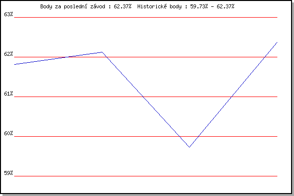 Závod| Body | Výkonnost | Změna | 20.05.2015 | Palackého vrch, 7.1 km | 61.81% | 61.81% | | 17.06.2015 | Pisárky Anthropos, 6 km | 62.12% | 62.02% | +0.21% | 15.07.2015 | Atletický stadión Pod Palackého vrche | 59.73% | 61.40% | -0.62% | 29.07.2015 | Palackého vrch, 7.1 km | 62.37% | 61.95% | +0.55% | | |