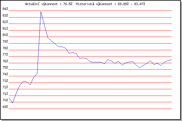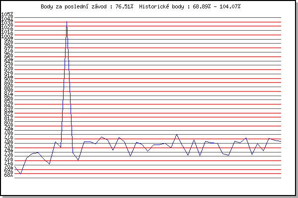 ZávodBodyVýkonnostZměna| 27.05.2015 | Obřany, 8.8 km | 70.67% | 70.67% | | | 03.06.2015 | Líšeň, 11 km | 68.89% | 69.89% | -0.78% | | 10.06.2015 | Popůvky, 7.9 km | 72.59% | 71.39% | +1.50% | | 17.06.2015 | Pisárky Anthropos, 6 km | 73.61% | 72.54% | +1.15% | | 24.06.2015 | Palackého vrch, 7.1 km | 73.87% | 73.20% | +0.66% | | 01.07.2015 | Obřany, 8.8 km | 72.46% | 73.12% | -0.08% | | 15.07.2015 | Atletický stadión Pod Palackého vrche | 71.19% | 72.64% | -0.48% | | 22.07.2015 | Pisárky Anthropos, 6 km | 76.33% | 73.84% | +1.20% | | 29.07.2015 | Palackého vrch, 7.1 km | 75.05% | 74.34% | +0.50% | | 05.08.2015 | Obřany, 8.8 km | 104.07% | 83.87% | +9.53% | | 12.08.2015 | Atletický stadión Pod Palackého vrche | 73.80% | 81.84% | -2.03% | | 02.09.2015 | Atletický stadión Pod Palackého vrche | 72.07% | 79.86% | -1.98% | | 26.04.2017 | Pisárky Anthropos, 6 km | 76.36% | 79.35% | -0.51% | | 03.05.2017 | Hotel Myslivna, 7 km | 76.36% | 78.94% | -0.41% | | 10.05.2017 | Popůvky, 7.9 km | 75.88% | 78.49% | -0.45% | | 17.05.2017 | Palackého vrch, 7.1 km | 77.48% | 78.47% | -0.02% | | 24.05.2017 | Obřany, 8.8 km | 76.78% | 78.27% | -0.20% | | 31.05.2017 | Líšeň, 11 km | 74.36% | 77.49% | -0.78% | | 07.06.2017 | Pisárky Anthropos, 6 km | 77.34% | 77.61% | +0.12% | | 28.06.2017 | Obřany, 8.8 km | 76.37% | 77.46% | -0.15% | | 12.07.2017 | Atletický stadión Pod Palackého vrche | 73.02% | 76.73% | -0.73% | | 19.07.2017 | Pisárky Anthropos, 6 km | 76.28% | 76.80% | +0.07% | | 26.07.2017 | Palackého vrch, 7.1 km | 75.74% | 76.67% | -0.13% | | 09.08.2017 | Hotel Myslivna, 7 km | 74.22% | 76.19% | -0.48% | | 23.08.2017 | Popůvky, 7.9 km | 75.60% | 76.14% | -0.05% | | 30.08.2017 | Atletický stadión Pod Palackého vrche | 75.61% | 76.11% | -0.03% | | 18.07.2018 | Obřany, 8.8 km | 75.95% | 76.15% | +0.04% | | 17.04.2019 | Atletický stadión Pod Palackého vrche | 74.96% | 75.91% | -0.24% | | 15.05.2019 | Kociánka, 3.2 km | 78.10% | 76.52% | +0.61% | | 22.05.2019 | Obřany, 8.8 km | 75.44% | 76.33% | -0.19% | | 29.05.2019 | Líšeň, 11 km | 73.21% | 75.95% | -0.38% | | 05.06.2019 | Palackého vrch, 7.1 km | 76.80% | 76.27% | +0.32% | | 19.06.2019 | Atletický stadión Pod Palackého vrche | 73.16% | 75.68% | -0.59% | | 10.07.2019 | Hotel Myslivna, 7 km | 76.44% | 76.00% | +0.32% | | 17.07.2019 | Palackého vrch, 7.1 km | 76.09% | 76.16% | +0.16% | | 07.08.2019 | Hotel Myslivna, 7 km | 76.04% | 76.24% | +0.08% | | 14.08.2019 | Palackého vrch, 7.1 km | 73.57% | 75.73% | -0.51% | | 21.08.2019 | Atletický stadión Pod Palackého vrche | 73.31% | 75.27% | -0.46% | | 28.08.2019 | Obřany, 8.8 km | 76.51% | 75.68% | +0.41% | | 04.09.2019 | Hotel Myslivna, 7 km | 76.17% | 75.91% | +0.23% | | 11.09.2019 | Pisárky Anthropos, 6 km | 77.22% | 76.36% | +0.45% | | 01.07.2020 | Atletický stadión Pod Palackého vrche | 73.42% | 75.78% | -0.58% | | 08.07.2020 | Pisárky Anthropos, 6 km | 75.90% | 75.93% | +0.15% | | 15.07.2020 | Obřany, 8.8 km | 74.26% | 75.64% | -0.29% | | 22.07.2020 | Kociánka, 2.7 km | 77.09% | 76.11% | +0.47% | | 12.08.2020 | Palackého vrch, 7.1 km | 76.73% | 76.35% | +0.24% | | 19.08.2020 | Obřany, 8.8 km | 76.51% | 76.50% | +0.15% | | | | |