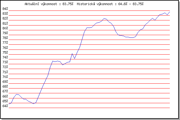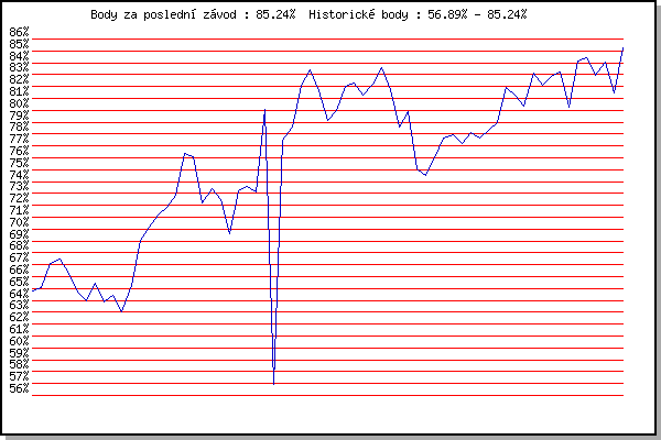 ZávodBodyVýkonnostZměna| 17.06.2015 | Pisárky Anthropos, 6 km | 64.80% | 64.80% | | | 24.06.2015 | Palackého vrch, 7.1 km | 65.10% | 65.01% | +0.21% | | 01.07.2015 | Obřany, 8.8 km | 67.08% | 66.10% | +1.09% | | 15.07.2015 | Atletický stadión Pod Palackého vrche | 67.47% | 66.78% | +0.68% | | 22.07.2015 | Pisárky Anthropos, 6 km | 66.31% | 66.73% | -0.05% | | 29.07.2015 | Palackého vrch, 7.1 km | 64.75% | 66.23% | -0.50% | | 05.08.2015 | Obřany, 8.8 km | 63.94% | 65.81% | -0.42% | | 12.08.2015 | Atletický stadión Pod Palackého vrche | 65.41% | 65.80% | -0.01% | | 19.08.2015 | Líšeň, 10.6 km | 63.89% | 65.38% | -0.42% | | 26.08.2015 | Popůvky, 7.9 km | 64.42% | 65.19% | -0.19% | | 02.09.2015 | Atletický stadión Pod Palackého vrche | 63.06% | 64.89% | -0.30% | | 28.09.2015 | Blažovice – Svatováclavský běh, 11 km | 65.30% | 65.07% | +0.18% | | 20.04.2016 | Atletický stadión Pod Palackého vrche | 69.09% | 66.22% | +1.15% | | 27.04.2016 | Pisárky Anthropos, 6 km | 70.19% | 67.39% | +1.17% | | 04.05.2016 | Líšeň, 11 km | 71.18% | 68.55% | +1.16% | | 11.05.2016 | Popůvky, 7.9 km | 71.80% | 69.61% | +1.06% | | 25.05.2016 | Obřany, 8.8 km | 72.89% | 70.68% | +1.07% | | 08.06.2016 | Popůvky, 7.9 km | 76.35% | 72.42% | +1.74% | | 15.06.2016 | Pisárky Anthropos, 6 km | 76.06% | 73.65% | +1.23% | | 22.06.2016 | Palackého vrch Běh Olympijského dne | 72.17% | 73.51% | -0.14% | | 29.06.2016 | Obřany, 8.8 km | 73.43% | 73.65% | +0.14% | | 27.07.2016 | Palackého vrch, 7.1 km | 72.52% | 73.49% | -0.16% | | 10.08.2016 | Hotel Myslivna, 7 km | 69.63% | 72.81% | -0.68% | | 17.08.2016 | Líšeň, 11 km | 73.20% | 73.06% | +0.25% | | 24.08.2016 | Popůvky, 7.9 km | 73.60% | 73.36% | +0.30% | | 07.09.2016 | Pisárky Anthropos, 6 km | 73.17% | 73.42% | +0.06% | | 26.04.2017 | Pisárky Anthropos, 6 km | 80.05% | 75.20% | +1.78% | | 03.05.2017 | Hotel Myslivna, 7 km | 56.89% | 74.11% | -1.09% | | 10.05.2017 | Popůvky, 7.9 km | 77.48% | 75.31% | +1.20% | | 17.05.2017 | Palackého vrch, 7.1 km | 78.61% | 76.41% | +1.10% | | 24.05.2017 | Obřany, 8.8 km | 82.11% | 78.08% | +1.67% | | 31.05.2017 | Líšeň, 11 km | 83.39% | 79.68% | +1.60% | | 07.06.2017 | Pisárky Anthropos, 6 km | 81.64% | 80.49% | +0.81% | | 21.06.2017 | Palackého vrch, 7.1 km | 79.15% | 80.49% | 0.00% | | 28.06.2017 | Obřany, 8.8 km | 79.99% | 80.55% | +0.06% | | 12.07.2017 | Atletický stadión Pod Palackého vrche | 82.03% | 81.06% | +0.51% | | 19.07.2017 | Pisárky Anthropos, 6 km | 82.26% | 81.47% | +0.41% | | 26.07.2017 | Palackého vrch, 7.1 km | 81.31% | 81.55% | +0.08% | | 02.08.2017 | Líšeň, 11 km | 82.24% | 81.82% | +0.27% | | 16.08.2017 | Obřany, 8.8 km | 83.62% | 82.37% | +0.55% | | 23.08.2017 | Popůvky, 7.9 km | 81.71% | 82.29% | -0.08% | | 06.09.2017 | Líšeň, 11 km | 78.57% | 81.72% | -0.57% | | 13.09.2017 | Pisárky Anthropos, 6 km | 79.93% | 81.43% | -0.29% | | 25.04.2018 | Atletický stadión Pod Palackého vrche | 75.05% | 80.76% | -0.67% | | 09.05.2018 | Popůvky, 7.9 km | 74.53% | 79.64% | -1.12% | | 16.05.2018 | Palackého vrch, 7.1 km | 76.01% | 78.98% | -0.66% | | 23.05.2018 | Obřany, 8.8 km | 77.70% | 78.85% | -0.13% | | 30.05.2018 | Líšeň, 11 km | 77.96% | 78.81% | -0.04% | | 06.06.2018 | Pisárky Anthropos, 6 km | 77.21% | 78.55% | -0.26% | | 13.06.2018 | Atletický stadión Pod Palackého vrche | 78.13% | 78.57% | +0.02% | | 27.06.2018 | Popůvky, 7.9 km | 77.68% | 78.43% | -0.14% | | 11.07.2018 | Hotel Myslivna, 7 km | 78.33% | 78.46% | +0.03% | | 12.09.2018 | Pisárky Anthropos, 6 km | 78.97% | 78.64% | +0.18% | | 17.04.2019 | Atletický stadión Pod Palackého vrche | 81.91% | 79.52% | +0.88% | | 24.04.2019 | Pisárky Anthropos, 6 km | 81.28% | 80.06% | +0.54% | | 15.05.2019 | Kociánka, 3.2 km | 80.39% | 80.25% | +0.19% | | 05.06.2019 | Palackého vrch, 7.1 km | 83.15% | 81.09% | +0.84% | | 12.06.2019 | Popůvky, 7.9 km | 82.15% | 81.50% | +0.41% | | 26.06.2019 | Pisárky Anthropos, 6 km | 82.89% | 81.99% | +0.49% | | 03.07.2019 | Obřany, 8.8 km | 83.17% | 82.43% | +0.44% | | 10.07.2019 | Hotel Myslivna, 7 km | 80.22% | 81.99% | -0.44% | | 17.07.2019 | Palackého vrch, 7.1 km | 84.12% | 82.61% | +0.62% | | 07.08.2019 | Hotel Myslivna, 7 km | 84.38% | 83.17% | +0.56% | | 14.08.2019 | Palackého vrch, 7.1 km | 82.90% | 83.25% | +0.08% | | 28.08.2019 | Obřany, 8.8 km | 84.03% | 83.55% | +0.30% | | 04.09.2019 | Hotel Myslivna, 7 km | 81.44% | 83.14% | -0.41% | | 11.09.2019 | Pisárky Anthropos, 6 km | 85.24% | 83.75% | +0.61% | | | | |