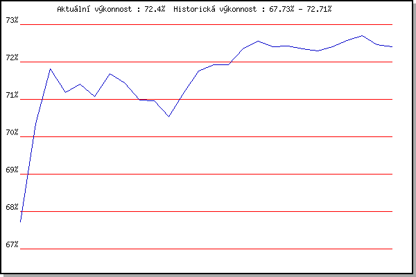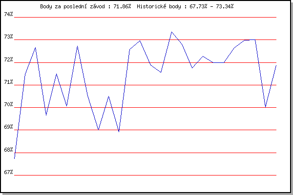 ZávodBodyVýkonnostZměna| 24.06.2015 | Palackého vrch, 7.1 km | 67.73% | 67.73% | | | 01.07.2015 | Obřany, 8.8 km | 71.47% | 70.35% | +2.62% | | 08.07.2015 | Popůvky, 7.9 km | 72.67% | 71.81% | +1.46% | | 22.07.2015 | Pisárky Anthropos, 6 km | 69.65% | 71.18% | -0.63% | | 29.07.2015 | Palackého vrch, 7.1 km | 71.49% | 71.41% | +0.23% | | 05.08.2015 | Obřany, 8.8 km | 70.06% | 71.07% | -0.34% | | 26.08.2015 | Popůvky, 7.9 km | 72.73% | 71.69% | +0.62% | | 02.09.2015 | Atletický stadión Pod Palackého vrche | 70.53% | 71.44% | -0.25% | | 09.09.2015 | Líšeň, 11 km | 69.00% | 70.99% | -0.45% | | 20.04.2016 | Atletický stadión Pod Palackého vrche | 70.49% | 70.96% | -0.03% | | 27.04.2016 | Pisárky Anthropos, 6 km | 68.92% | 70.53% | -0.43% | | 04.05.2016 | Líšeň, 11 km | 72.58% | 71.18% | +0.65% | | 11.05.2016 | Popůvky, 7.9 km | 72.97% | 71.76% | +0.58% | | 18.05.2016 | Palackého vrch, 7.1 km | 71.88% | 71.93% | +0.17% | | 25.05.2016 | Obřany, 8.8 km | 71.55% | 71.93% | 0.00% | | 01.06.2016 | Líšeň, 11 km | 73.34% | 72.37% | +0.44% | | 08.06.2016 | Popůvky, 7.9 km | 72.80% | 72.56% | +0.19% | | 15.06.2016 | Pisárky Anthropos, 6 km | 71.75% | 72.41% | -0.15% | | 29.06.2016 | Obřany, 8.8 km | 72.28% | 72.42% | +0.01% | | 13.07.2016 | Atletický stadión Pod Palackého vrche | 71.99% | 72.35% | -0.07% | | 20.07.2016 | Pisárky Anthropos, 6 km | 72.00% | 72.29% | -0.06% | | 27.07.2016 | Palackého vrch, 7.1 km | 72.63% | 72.40% | +0.11% | | 03.08.2016 | Obřany, 8.8 km | 72.98% | 72.57% | +0.17% | | 24.08.2016 | Popůvky, 7.9 km | 73.00% | 72.71% | +0.14% | | 31.08.2016 | Atletický stadión Pod Palackého vrche | 70.03% | 72.46% | -0.25% | | 07.09.2016 | Pisárky Anthropos, 6 km | 71.86% | 72.40% | -0.06% | | | | |