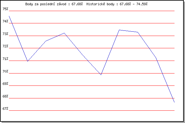 ZávodBodyVýkonnostZměna| 13.08.2008 | Veselka, Popůvky Vintrovna, 7.9 km | 74.59% | 74.59% | | | 28.09.2008 | Blažovice Svatováclavský běh, 11 km | 70.96% | 73.00% | -1.59% | | 13.05.2009 | Pisárky Anthropos, 6.3 km | 72.58% | 72.99% | -0.01% | | 20.05.2009 | Obřany, 8.8 km | 73.22% | 73.26% | +0.27% | | 17.06.2009 | Obřany, 8.8 km | 71.48% | 72.74% | -0.52% | | 15.07.2009 | Pisárky Anthropos, 6.3 km | 69.87% | 72.19% | -0.55% | | 29.07.2009 | Obřany, 8.8 km | 73.47% | 72.74% | +0.55% | | 05.08.2009 | Líšeň Mariánské údolí, 11.1 km | 73.30% | 73.01% | +0.27% | | 12.05.2010 | Pisárky Anthropos, 6.3 km | 71.24% | 72.62% | -0.39% | | 26.05.2010 | Obřany, 8.8 km | 67.68% | 72.04% | -0.58% | | | | |