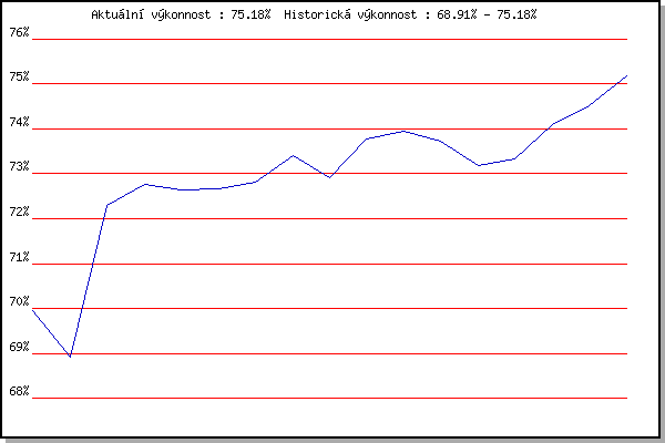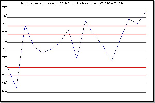 ZávodBodyVýkonnostZměna| 24.06.2015 | Palackého vrch, 7.1 km | 69.96% | 69.96% | | | 22.06.2016 | Palackého vrch Běh Olympijského dne | 67.59% | 68.91% | -1.05% | | 02.06.2021 | Pod Palackého vrchem 10 km | 75.12% | 72.29% | +3.38% | | 09.06.2021 | Pisárky | 72.51% | 72.77% | +0.48% | | 16.06.2021 | Palackého vrch | 71.77% | 72.64% | -0.13% | | 23.06.2021 | Obřany | 72.18% | 72.66% | +0.02% | | 30.06.2021 | Líšeň | 72.97% | 72.81% | +0.15% | | 07.07.2021 | Pisárky | 74.53% | 73.40% | +0.59% | | 14.07.2021 | Myslivna | 71.07% | 72.92% | -0.48% | | 21.07.2021 | Obřany | 75.59% | 73.78% | +0.86% | | 28.07.2021 | Palackého vrch | 73.85% | 73.94% | +0.16% | | 04.08.2021 | Pisárky | 72.68% | 73.72% | -0.22% | | 11.08.2021 | Popůvky | 70.79% | 73.18% | -0.54% | | 18.08.2021 | Myslivna | 73.31% | 73.33% | +0.15% | | 25.08.2021 | Líšeň | 75.81% | 74.10% | +0.77% | | 01.09.2021 | Obřany | 75.23% | 74.51% | +0.41% | | 15.09.2021 | Pod Palackého vrchem 5 km | 76.74% | 75.18% | +0.67% | | | | |
