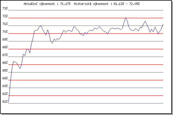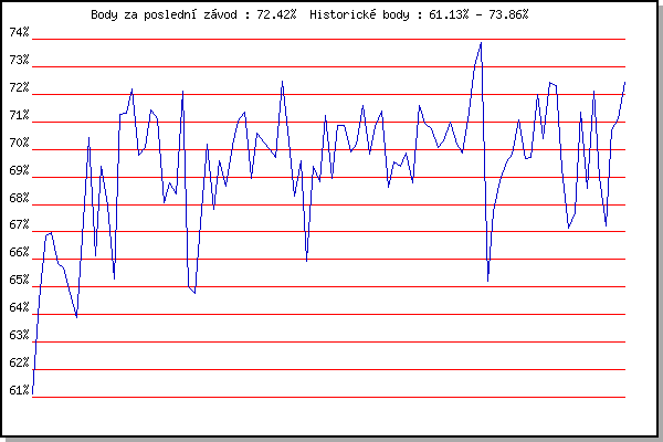 ZávodBodyVýkonnostZměna| 24.06.2015 | Palackého vrch, 7.1 km | 61.13% | 61.13% | | | 15.07.2015 | Atletický stadión Pod Palackého vrche | 64.52% | 63.51% | +2.38% | | 22.07.2015 | Pisárky Anthropos, 6 km | 66.87% | 65.48% | +1.97% | | 29.07.2015 | Palackého vrch, 7.1 km | 66.99% | 66.37% | +0.89% | | 05.08.2015 | Obřany, 8.8 km | 65.87% | 66.32% | -0.05% | | 12.08.2015 | Atletický stadión Pod Palackého vrche | 65.69% | 66.23% | -0.09% | | 19.08.2015 | Líšeň, 10.6 km | 64.78% | 65.86% | -0.37% | | 26.08.2015 | Popůvky, 7.9 km | 63.90% | 65.49% | -0.37% | | 02.09.2015 | Atletický stadión Pod Palackého vrche | 66.82% | 65.97% | +0.48% | | 20.04.2016 | Atletický stadión Pod Palackého vrche | 70.43% | 67.34% | +1.37% | | 27.04.2016 | Pisárky Anthropos, 6 km | 66.13% | 67.15% | -0.19% | | 11.05.2016 | Popůvky, 7.9 km | 69.38% | 67.88% | +0.73% | | 25.05.2016 | Obřany, 8.8 km | 67.93% | 68.01% | +0.13% | | 01.06.2016 | Líšeň, 11 km | 65.31% | 67.47% | -0.54% | | 08.06.2016 | Popůvky, 7.9 km | 71.25% | 68.58% | +1.11% | | 15.06.2016 | Pisárky Anthropos, 6 km | 71.31% | 69.46% | +0.88% | | 22.06.2016 | Palackého vrch Běh Olympijského dne | 72.20% | 70.35% | +0.89% | | 29.06.2016 | Obřany, 8.8 km | 69.79% | 70.42% | +0.07% | | 20.07.2016 | Pisárky Anthropos, 6 km | 70.05% | 70.49% | +0.07% | | 27.07.2016 | Palackého vrch, 7.1 km | 71.44% | 70.86% | +0.37% | | 03.08.2016 | Obřany, 8.8 km | 71.11% | 70.99% | +0.13% | | 10.08.2016 | Hotel Myslivna, 7 km | 68.05% | 70.47% | -0.52% | | 24.08.2016 | Popůvky, 7.9 km | 68.78% | 70.16% | -0.31% | | 31.08.2016 | Atletický stadión Pod Palackého vrche | 68.37% | 69.82% | -0.34% | | 07.09.2016 | Pisárky Anthropos, 6 km | 72.13% | 70.48% | +0.66% | | 26.04.2017 | Pisárky Anthropos, 6 km | 65.01% | 69.89% | -0.59% | | 10.05.2017 | Popůvky, 7.9 km | 64.78% | 68.94% | -0.95% | | 31.05.2017 | Líšeň, 11 km | 67.32% | 68.73% | -0.21% | | 07.06.2017 | Pisárky Anthropos, 6 km | 70.19% | 69.28% | +0.55% | | 14.06.2017 | Popůvky, 7.9 km | 67.82% | 69.12% | -0.16% | | 21.06.2017 | Palackého vrch, 7.1 km | 69.58% | 69.32% | +0.20% | | 12.07.2017 | Atletický stadión Pod Palackého vrche | 68.68% | 69.26% | -0.06% | | 19.07.2017 | Pisárky Anthropos, 6 km | 70.15% | 69.56% | +0.30% | | 26.07.2017 | Palackého vrch, 7.1 km | 71.02% | 70.01% | +0.45% | | 02.08.2017 | Líšeň, 11 km | 71.35% | 70.45% | +0.44% | | 09.08.2017 | Hotel Myslivna, 7 km | 68.94% | 70.16% | -0.29% | | 16.08.2017 | Obřany, 8.8 km | 70.58% | 70.33% | +0.17% | | 23.08.2017 | Popůvky, 7.9 km | 70.25% | 70.38% | +0.05% | | 30.08.2017 | Atletický stadión Pod Palackého vrche | 70.03% | 70.37% | -0.01% | | 06.09.2017 | Líšeň, 11 km | 69.71% | 70.26% | -0.11% | | 13.09.2017 | Pisárky Anthropos, 6 km | 72.46% | 70.85% | +0.59% | | 25.04.2018 | Atletický stadión Pod Palackého vrche | 70.66% | 70.86% | +0.01% | | 02.05.2018 | Hotel Myslivna, 7 km | 68.31% | 70.51% | -0.35% | | 23.05.2018 | Obřany, 8.8 km | 69.57% | 70.38% | -0.13% | | 30.05.2018 | Líšeň, 11 km | 65.94% | 69.94% | -0.44% | | 06.06.2018 | Pisárky Anthropos, 6 km | 69.40% | 69.91% | -0.03% | | 13.06.2018 | Atletický stadión Pod Palackého vrche | 68.84% | 69.73% | -0.18% | | 20.06.2018 | Palackého vrch, 7.1 km | 71.23% | 70.16% | +0.43% | | 27.06.2018 | Popůvky, 7.9 km | 68.96% | 69.93% | -0.23% | | 18.07.2018 | Obřany, 8.8 km | 70.85% | 70.21% | +0.28% | | 01.08.2018 | Pisárky Anthropos, 6 km | 70.85% | 70.44% | +0.23% | | 08.08.2018 | Hotel Myslivna, 7 km | 69.90% | 70.38% | -0.06% | | 15.08.2018 | Popůvky, 7.9 km | 70.19% | 70.40% | +0.02% | | 22.08.2018 | Palackého vrch, 7.1 km | 71.60% | 70.75% | +0.35% | | 29.08.2018 | Atletický stadión Pod Palackého vrche | 69.81% | 70.57% | -0.18% | | 05.09.2018 | Obřany, 8.8 km | 70.82% | 70.67% | +0.10% | | 12.09.2018 | Pisárky Anthropos, 6 km | 71.37% | 70.89% | +0.22% | | 15.05.2019 | Kociánka, 3.2 km | 68.62% | 70.58% | -0.31% | | 22.05.2019 | Obřany, 8.8 km | 69.54% | 70.41% | -0.17% | | 29.05.2019 | Líšeň, 11 km | 69.39% | 70.21% | -0.20% | | 12.06.2019 | Popůvky, 7.9 km | 69.87% | 70.17% | -0.04% | | 19.06.2019 | Atletický stadión Pod Palackého vrche | 68.79% | 69.94% | -0.23% | | 03.07.2019 | Obřany, 8.8 km | 71.58% | 70.41% | +0.47% | | 10.07.2019 | Hotel Myslivna, 7 km | 70.94% | 70.62% | +0.21% | | 17.07.2019 | Palackého vrch, 7.1 km | 70.74% | 70.70% | +0.08% | | 24.07.2019 | Líšeň, 11 km | 70.08% | 70.61% | -0.09% | | 31.07.2019 | Popůvky, 7.9 km | 70.31% | 70.58% | -0.03% | | 07.08.2019 | Hotel Myslivna, 7 km | 70.97% | 70.72% | +0.14% | | 14.08.2019 | Palackého vrch, 7.1 km | 70.19% | 70.62% | -0.10% | | 21.08.2019 | Atletický stadión Pod Palackého vrche | 69.88% | 70.48% | -0.14% | | 28.08.2019 | Obřany, 8.8 km | 71.34% | 70.72% | +0.24% | | 04.09.2019 | Hotel Myslivna, 7 km | 73.03% | 71.34% | +0.62% | | 11.09.2019 | Pisárky Anthropos, 6 km | 73.86% | 72.05% | +0.71% | | 01.07.2020 | Atletický stadión Pod Palackého vrche | 65.20% | 71.59% | -0.46% | | 08.07.2020 | Pisárky Anthropos, 6 km | 67.74% | 70.84% | -0.75% | | 15.07.2020 | Obřany, 8.8 km | 68.86% | 70.50% | -0.34% | | 29.07.2020 | Hotel Myslivna, 7 km | 69.54% | 70.40% | -0.10% | | 12.08.2020 | Palackého vrch, 7.1 km | 69.82% | 70.36% | -0.04% | | 19.08.2020 | Obřany, 8.8 km | 71.07% | 70.61% | +0.25% | | 26.08.2020 | Atletický stadión Pod Palackého vrche | 69.68% | 70.47% | -0.14% | | 02.09.2020 | Líšeň, 11 km | 69.72% | 70.33% | -0.14% | | 09.09.2020 | Pisárky Anthropos, 6 km | 72.00% | 70.80% | +0.47% | | 16.09.2020 | Atletický stadión Pod Palackého vrche | 70.40% | 70.75% | -0.05% | | 02.06.2021 | Pod Palackého vrchem 10 km | 72.44% | 71.23% | +0.48% | | 23.06.2021 | Obřany | 72.32% | 71.58% | +0.35% | | 30.06.2021 | Líšeň | 69.30% | 71.18% | -0.40% | | 07.07.2021 | Pisárky | 67.14% | 70.74% | -0.44% | | 14.07.2021 | Myslivna | 67.69% | 70.14% | -0.60% | | 21.07.2021 | Obřany | 71.34% | 70.57% | +0.43% 