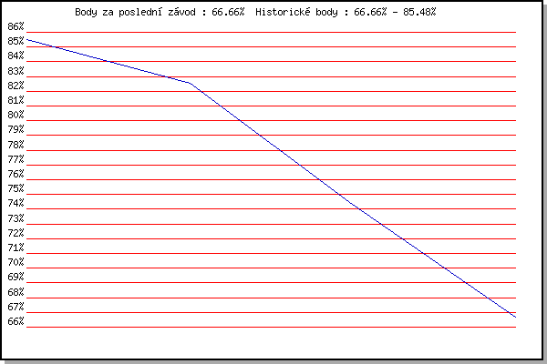 Závod| Body | Výkonnost | Změna | 28.09.2008 | Blažovice Svatováclavský běh, 11 km | 85.48% | 85.48% | | 28.09.2010 | Blažovice Svatováclavský běh, 9.4 km | 82.51% | 84.17% | -1.31% | 28.09.2014 | Blažovice – Svatováclavský běh, 11 km | 74.36% | 81.46% | -2.71% | 28.09.2015 | Blažovice – Svatováclavský běh, 11 km | 66.66% | 77.93% | -3.53% | | |