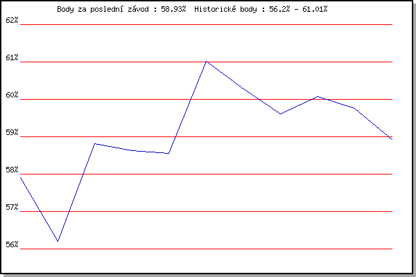 ZávodBodyVýkonnostZměna| 15.07.2015 | Atletický stadión Pod Palackého vrche | 57.90% | 57.90% | | | 02.09.2015 | Atletický stadión Pod Palackého vrche | 56.20% | 57.15% | -0.75% | | 09.09.2015 | Líšeň, 11 km | 58.81% | 58.10% | +0.95% | | 16.09.2015 | Pisárky Anthropos, 6 km | 58.63% | 58.48% | +0.38% | | 27.04.2016 | Pisárky Anthropos, 6 km | 58.55% | 58.57% | +0.09% | | 04.05.2016 | Líšeň, 11 km | 61.01% | 59.46% | +0.89% | | 11.05.2016 | Popůvky, 7.9 km | 60.28% | 59.77% | +0.31% | | 18.05.2016 | Palackého vrch, 7.1 km | 59.61% | 59.80% | +0.03% | | 25.05.2016 | Obřany, 8.8 km | 60.08% | 59.95% | +0.15% | | 01.06.2016 | Líšeň, 11 km | 59.75% | 59.97% | +0.02% | | 14.06.2017 | Popůvky, 7.9 km | 58.93% | 59.75% | -0.22% | | | | |