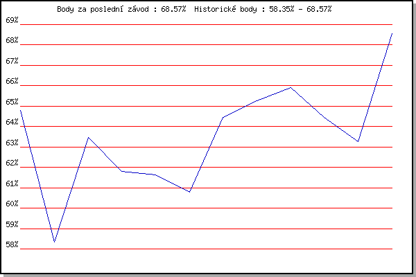 ZávodBodyVýkonnostZměna| 22.07.2015 | Pisárky Anthropos, 6 km | 64.80% | 64.79% | | | 29.07.2015 | Palackého vrch, 7.1 km | 58.35% | 62.02% | -2.77% | | 20.04.2016 | Atletický stadión Pod Palackého vrche | 63.48% | 63.13% | +1.11% | | 27.04.2016 | Pisárky Anthropos, 6 km | 61.79% | 62.96% | -0.17% | | 18.05.2016 | Palackého vrch, 7.1 km | 61.62% | 62.61% | -0.35% | | 25.05.2016 | Obřany, 8.8 km | 60.79% | 62.15% | -0.46% | | 08.06.2016 | Popůvky, 7.9 km | 64.44% | 62.97% | +0.82% | | 15.06.2016 | Pisárky Anthropos, 6 km | 65.26% | 63.80% | +0.83% | | 20.07.2016 | Pisárky Anthropos, 6 km | 65.90% | 64.54% | +0.74% | | 07.09.2016 | Pisárky Anthropos, 6 km | 64.46% | 64.68% | +0.14% | | 26.04.2017 | Pisárky Anthropos, 6 km | 63.26% | 64.45% | -0.23% | | 14.08.2019 | Palackého vrch, 7.1 km | 68.57% | 65.65% | +1.20% | | | | |