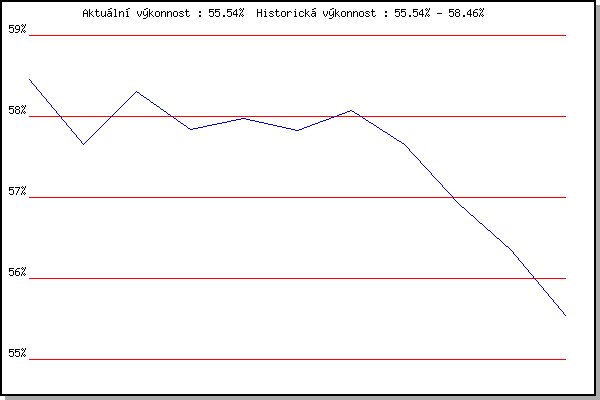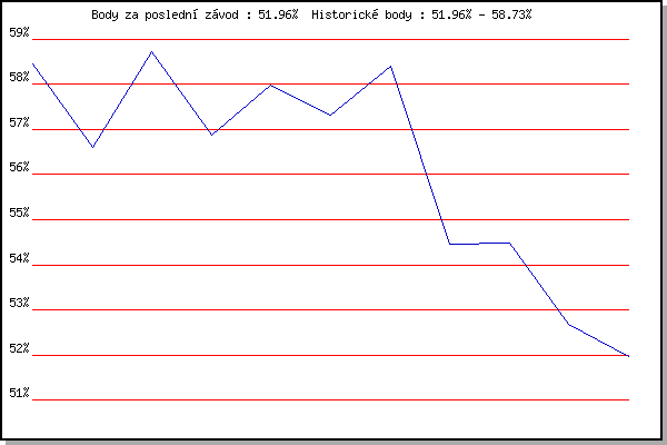 ZávodBodyVýkonnostZměna| 29.07.2015 | Palackého vrch, 7.1 km | 58.46% | 58.46% | | | 05.08.2015 | Obřany, 8.8 km | 56.61% | 57.65% | -0.81% | | 12.08.2015 | Atletický stadión Pod Palackého vrche | 58.73% | 58.31% | +0.66% | | 26.08.2015 | Popůvky, 7.9 km | 56.88% | 57.84% | -0.47% | | 09.09.2015 | Líšeň, 11 km | 57.98% | 57.97% | +0.13% | | 20.04.2016 | Atletický stadión Pod Palackého vrche | 57.33% | 57.83% | -0.14% | | 18.05.2016 | Palackého vrch, 7.1 km | 58.40% | 58.07% | +0.24% | | 24.08.2016 | Popůvky, 7.9 km | 54.46% | 57.65% | -0.42% | | 07.06.2017 | Pisárky Anthropos, 6 km | 54.49% | 56.93% | -0.72% | | 15.07.2020 | Obřany, 8.8 km | 52.68% | 56.34% | -0.59% | | 09.09.2020 | Pisárky Anthropos, 6 km | 51.96% | 55.54% | -0.80% | | | | |