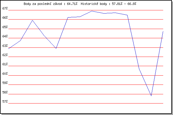 ZávodBodyVýkonnostZměna| 29.07.2015 | Palackého vrch, 7.1 km | 62.86% | 62.86% | | | 12.08.2015 | Atletický stadión Pod Palackého vrche | 63.73% | 63.47% | +0.61% | | 09.09.2015 | Líšeň, 11 km | 65.92% | 64.79% | +1.32% | | 28.09.2015 | Blažovice – Svatováclavský běh, 11 km | 64.25% | 64.70% | -0.09% | | 20.04.2016 | Atletický stadión Pod Palackého vrche | 62.89% | 64.18% | -0.52% | | 18.05.2016 | Palackého vrch, 7.1 km | 66.24% | 64.97% | +0.79% | | 24.08.2016 | Popůvky, 7.9 km | 66.30% | 65.53% | +0.56% | | 10.05.2017 | Popůvky, 7.9 km | 66.90% | 66.07% | +0.54% | | 07.06.2017 | Pisárky Anthropos, 6 km | 66.65% | 66.36% | +0.29% | | 30.08.2017 | Atletický stadión Pod Palackého vrche | 66.73% | 66.58% | +0.22% | | 25.04.2018 | Atletický stadión Pod Palackého vrche | 66.48% | 66.59% | +0.01% | | 09.05.2018 | Popůvky, 7.9 km | 60.71% | 65.98% | -0.61% | | 17.04.2019 | Atletický stadión Pod Palackého vrche | 57.81% | 64.86% | -1.12% | | 08.07.2020 | Pisárky Anthropos, 6 km | 64.71% | 65.06% | +0.20% | | | | |