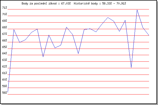 ZávodBodyVýkonnostZměna| 28.09.2009 | Blažovice Svatováclavský běh, 11 km | 58.33% | 58.33% | | | 08.05.2010 | Běh o pohár pivovaru Černá hora, 9. | 67.91% | 65.14% | +6.81% | | 12.05.2010 | Pisárky Anthropos, 6.3 km | 65.93% | 66.20% | +1.06% | | 19.05.2010 | Palackého vrch , 7.1 km | 66.36% | 66.66% | +0.46% | | 26.05.2010 | Obřany, 8.8 km | 67.48% | 67.01% | +0.35% | | 02.06.2010 | Líšeň Mariánské údolí, 11.1 km | 67.99% | 67.42% | +0.41% | | 09.06.2010 | Veselka, Popůvky Vintrovna, 7.9 km | 63.72% | 66.72% | -0.70% | | 16.06.2010 | Pisárky Anthropos, 6.3 km | 67.08% | 67.01% | +0.29% | | 23.06.2010 | Palackého vrch Běh Olympijského dne | 65.12% | 66.63% | -0.38% | | 30.06.2010 | Obřany, 8.8 km | 65.50% | 66.40% | -0.23% | | 07.07.2010 | Líšeň Mariánské údolí, 11.1 km | 68.26% | 66.99% | +0.59% | | 14.07.2010 | Veselka, Popůvky Vintrovna, 7.9 km | 67.16% | 67.13% | +0.14% | | 21.07.2010 | Moravská Slavia dráha, 5 km | 64.23% | 66.63% | -0.50% | | 28.07.2010 | Pisárky Anthropos, 6.3 km | 67.90% | 67.08% | +0.45% | | 04.08.2010 | Palackého vrch , 7.1 km | 68.04% | 67.45% | +0.37% | | 11.08.2010 | Obřany, 8.8 km | 67.53% | 67.58% | +0.13% | | 25.08.2010 | Líšeň Mariánské údolí, 11.1 km | 68.72% | 67.97% | +0.39% | | 01.09.2010 | Veselka, Popůvky Vintrovna, 7.9 km | 69.77% | 68.48% | +0.51% | | 08.09.2010 | Pisárky Anthropos, 6.3 km | 69.19% | 68.73% | +0.25% | | 22.09.2010 | Moravská Slavia dráha, 15 km | 67.62% | 68.51% | -0.22% | | 28.09.2010 | Blažovice Svatováclavský běh, 9.4 km | 69.30% | 68.76% | +0.25% | | 29.08.2012 | Pisárky Anthropos, 6 km | 62.09% | 68.26% | -0.50% | | 28.09.2013 | Blažovice – Svatováclavský běh, 11 km | 70.91% | 69.13% | +0.87% | | 28.05.2014 | Obřany, 8.8 km | 68.18% | 69.01% | -0.12% | | 28.09.2014 | Blažovice – Svatováclavský běh, 11 km | 67.03% | 68.62% | -0.39% | | | | |