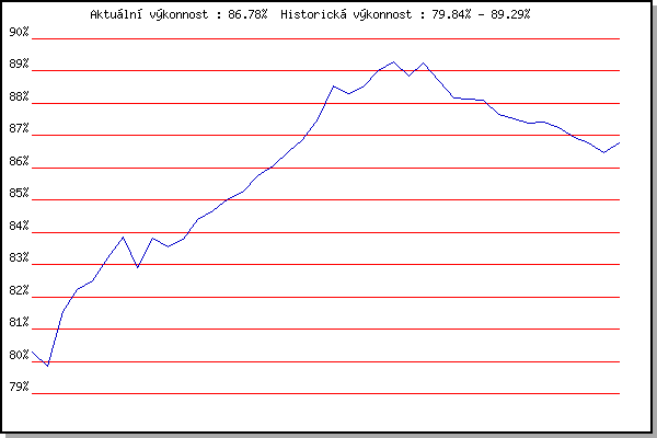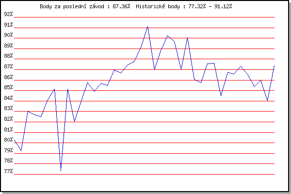 ZávodBodyVýkonnostZměna| 13.05.2009 | Pisárky Anthropos, 6.3 km | 80.30% | 80.29% | | | 03.06.2009 | Veselka, Popůvky Vintrovna, 7.9 km | 79.26% | 79.84% | -0.45% | | 10.06.2009 | Pisárky Anthropos, 6.3 km | 83.02% | 81.54% | +1.70% | | 17.06.2009 | Obřany, 8.8 km | 82.69% | 82.22% | +0.68% | | 01.07.2009 | Líšeň Mariánské údolí, 11.1 km | 82.53% | 82.49% | +0.27% | | 08.07.2009 | Veselka, Popůvky Vintrovna, 7.9 km | 84.15% | 83.20% | +0.71% | | 15.07.2009 | Pisárky Anthropos, 6.3 km | 85.13% | 83.86% | +0.66% | | 22.07.2009 | Moravská Slavia dráha, 15 km | 77.32% | 82.90% | -0.96% | | 29.07.2009 | Obřany, 8.8 km | 85.16% | 83.83% | +0.93% | | 05.08.2009 | Líšeň Mariánské údolí, 11.1 km | 82.05% | 83.56% | -0.27% | | 28.09.2009 | Blažovice Svatováclavský běh, 11 km | 84.01% | 83.79% | +0.23% | | 19.05.2010 | Palackého vrch , 7.1 km | 85.73% | 84.40% | +0.61% | | 26.05.2010 | Obřany, 8.8 km | 84.93% | 84.67% | +0.27% | | 02.06.2010 | Líšeň Mariánské údolí, 11.1 km | 85.70% | 85.05% | +0.38% | | 09.06.2010 | Veselka, Popůvky Vintrovna, 7.9 km | 85.48% | 85.26% | +0.21% | | 07.07.2010 | Líšeň Mariánské údolí, 11.1 km | 86.97% | 85.76% | +0.50% | | 14.07.2010 | Veselka, Popůvky Vintrovna, 7.9 km | 86.68% | 86.07% | +0.31% | | 21.07.2010 | Moravská Slavia dráha, 5 km | 87.46% | 86.49% | +0.42% | | 28.07.2010 | Pisárky Anthropos, 6.3 km | 87.75% | 86.88% | +0.39% | | 04.08.2010 | Palackého vrch , 7.1 km | 89.12% | 87.52% | +0.64% | | 11.08.2010 | Obřany, 8.8 km | 91.12% | 88.54% | +1.02% | | 18.08.2010 | Moravská Slavia dráha, 10 km | 87.01% | 88.30% | -0.24% | | 25.08.2010 | Líšeň Mariánské údolí, 11.1 km | 88.79% | 88.50% | +0.20% | | 01.09.2010 | Veselka, Popůvky Vintrovna, 7.9 km | 90.26% | 89.03% | +0.53% | | 08.09.2010 | Pisárky Anthropos, 6.3 km | 89.67% | 89.29% | +0.26% | | 22.09.2010 | Moravská Slavia dráha, 15 km | 87.00% | 88.84% | -0.45% | | 09.10.2010 | Mizuno sedmička, 7 km | 90.07% | 89.24% | +0.40% | | 18.05.2011 | Palackého vrch, 7.1 km | 86.06% | 88.72% | -0.52% | | 01.06.2011 | Líšeň Mariánské údolí, 11.1 km | 85.74% | 88.18% | -0.54% | | 15.06.2011 | Pisárky Anthropos, 6 km | 87.55% | 88.14% | -0.04% | | 29.06.2011 | Obřany, 8.8 km | 87.58% | 88.10% | -0.04% | | 20.07.2011 | AC Moravská Slávia, 5km atletický o | 84.49% | 87.64% | -0.46% | | 27.07.2011 | Pisárky Anthropos, 6 km | 86.73% | 87.52% | -0.12% | | 10.08.2011 | Obřany, 8.8 km | 86.57% | 87.37% | -0.15% | | 24.08.2011 | Líšeň Mariánské údolí, 11.1 km | 87.31% | 87.42% | +0.05% | | 31.08.2011 | Popůvky, 7.9 km | 86.52% | 87.25% | -0.17% | | 21.09.2011 | AC Moravská Slávia Brno, 1hod atlet | 85.37% | 86.95% | -0.30% | | 09.05.2012 | Pisárky Anthropos, 6 km | 85.98% | 86.79% | -0.16% | | 18.07.2012 | Atletický stadión Pod Palackého vrche | 84.03% | 86.46% | -0.33% | | 01.08.2012 | Palackého vrch, 7.1 km | 87.36% | 86.78% | +0.32% | | | | |