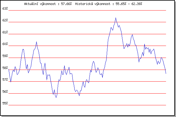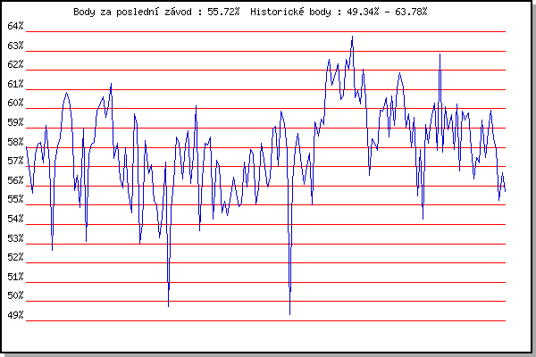 ZávodBodyVýkonnostZměna| 13.05.2009 | Pisárky Anthropos, 6.3 km | 58.04% | 58.03% | | | 20.05.2009 | Obřany, 8.8 km | 56.95% | 57.56% | -0.47% | | 27.05.2009 | Líšeň Mariánské údolí, 11.1 km | 55.63% | 56.96% | -0.60% | | 03.06.2009 | Veselka, Popůvky Vintrovna, 7.9 km | 57.66% | 57.38% | +0.42% | | 10.06.2009 | Pisárky Anthropos, 6.3 km | 58.16% | 57.78% | +0.40% | | 17.06.2009 | Obřany, 8.8 km | 58.26% | 58.00% | +0.22% | | 01.07.2009 | Líšeň Mariánské údolí, 11.1 km | 57.20% | 57.81% | -0.19% | | 08.07.2009 | Veselka, Popůvky Vintrovna, 7.9 km | 59.13% | 58.25% | +0.44% | | 15.07.2009 | Pisárky Anthropos, 6.3 km | 57.13% | 57.99% | -0.26% | | 22.07.2009 | Moravská Slavia dráha, 15 km | 52.66% | 57.58% | -0.41% | | 29.07.2009 | Obřany, 8.8 km | 57.18% | 57.64% | +0.06% | | 05.08.2009 | Líšeň Mariánské údolí, 11.1 km | 58.08% | 57.81% | +0.17% | | 12.08.2009 | Veselka, Popůvky Vintrovna, 7.9 km | 58.48% | 58.03% | +0.22% | | 12.05.2010 | Pisárky Anthropos, 6.3 km | 60.22% | 58.65% | +0.62% | | 19.05.2010 | Palackého vrch , 7.1 km | 60.86% | 59.30% | +0.65% | | 26.05.2010 | Obřany, 8.8 km | 60.44% | 59.71% | +0.41% | | 02.06.2010 | Líšeň Mariánské údolí, 11.1 km | 59.38% | 59.72% | +0.01% | | 09.06.2010 | Veselka, Popůvky Vintrovna, 7.9 km | 55.76% | 59.15% | -0.57% | | 23.06.2010 | Palackého vrch Běh Olympijského dne | 56.55% | 58.67% | -0.48% | | 30.06.2010 | Obřany, 8.8 km | 54.87% | 58.07% | -0.60% | | 07.07.2010 | Líšeň Mariánské údolí, 11.1 km | 59.00% | 58.44% | +0.37% | | 14.07.2010 | Veselka, Popůvky Vintrovna, 7.9 km | 53.14% | 57.72% | -0.72% | | 28.07.2010 | Pisárky Anthropos, 6.3 km | 57.65% | 57.87% | +0.15% | | 04.08.2010 | Palackého vrch , 7.1 km | 58.15% | 58.09% | +0.22% | | 11.08.2010 | Obřany, 8.8 km | 58.26% | 58.26% | +0.17% | | 18.08.2010 | Moravská Slavia dráha, 10 km | 59.87% | 58.77% | +0.51% | | 25.08.2010 | Líšeň Mariánské údolí, 11.1 km | 60.31% | 59.24% | +0.47% | | 01.09.2010 | Veselka, Popůvky Vintrovna, 7.9 km | 60.64% | 59.67% | +0.43% | | 08.09.2010 | Pisárky Anthropos, 6.3 km | 59.55% | 59.72% | +0.05% | | 22.09.2010 | Moravská Slavia dráha, 15 km | 60.20% | 59.92% | +0.20% | | 09.10.2010 | Mizuno sedmička, 7 km | 61.29% | 60.35% | +0.43% | | 11.05.2011 | Pisárky Anthropos, 6 km | 57.44% | 59.85% | -0.50% | | 18.05.2011 | Palackého vrch, 7.1 km | 58.21% | 59.56% | -0.29% | | 01.06.2011 | Líšeň Mariánské údolí, 11.1 km | 56.38% | 59.09% | -0.47% | | 15.06.2011 | Pisárky Anthropos, 6 km | 55.90% | 58.55% | -0.54% | | 23.06.2011 | Palackého vrch – Běh Olympijského dne | 57.96% | 58.52% | -0.03% | | 29.06.2011 | Obřany, 8.8 km | 55.78% | 58.02% | -0.50% | | 13.07.2011 | Popůvky, 7.9 km | 54.59% | 57.56% | -0.46% | | 20.07.2011 | AC Moravská Slávia, 5km atletický o | 59.76% | 58.22% | +0.66% | | 27.07.2011 | Pisárky Anthropos, 6 km | 59.12% | 58.56% | +0.34% | | 17.08.2011 | AC Moravská Slávia, 10km atletický | 53.01% | 57.86% | -0.70% | | 31.08.2011 | Popůvky, 7.9 km | 54.04% | 57.12% | -0.74% | | 07.09.2011 | Pisárky Anthropos, 6 km | 58.35% | 57.58% | +0.46% | | 21.09.2011 | AC Moravská Slávia Brno, 1hod atlet | 56.62% | 57.51% | -0.07% | | 28.09.2011 | Blažovice – Svatováclavský běh , 11 k | 57.09% | 57.57% | +0.06% | | 09.05.2012 | Pisárky Anthropos, 6 km | 55.19% | 57.11% | -0.46% | | 16.05.2012 | Palackého vrch, 7.1 km | 55.03% | 56.71% | -0.40% | | 23.05.2012 | Obřany, 8.8 km | 53.32% | 56.21% | -0.50% | | 30.05.2012 | Líšeň Mariánské údolí, 11 km | 54.35% | 55.89% | -0.32% | | 06.06.2012 | Popůvky, 7.9 km | 57.25% | 56.32% | +0.43% | | 20.06.2012 | Palackého vrch – Běh Olympijského dne | 49.76% | 55.76% | -0.56% | | 27.06.2012 | Obřany, 8.8 km | 54.81% | 55.65% | -0.11% | | 11.07.2012 | Popůvky, 7.9 km | 56.18% | 55.89% | +0.24% | | 18.07.2012 | Atletický stadión Pod Palackého vrche | 58.52% | 56.65% | +0.76% | | 25.07.2012 | Pisárky Anthropos, 6 km | 58.23% | 57.16% | +0.51% | | 01.08.2012 | Palackého vrch, 7.1 km | 56.34% | 57.07% | -0.09% | | 08.08.2012 | Obřany, 8.8 km | 58.14% | 57.45% | +0.38% | | 15.08.2012 | Atletický stadión Pod Palackého vrche | 58.88% | 57.91% | +0.46% | | 29.08.2012 | Pisárky Anthropos, 6 km | 56.14% | 57.56% | -0.35% | | 05.09.2012 | Popůvky, 7.9 km | 57.51% | 57.62% | +0.06% | | 19.09.2012 | Atletický stadión Pod Palackého vrche | 60.17% | 58.34% | +0.72% | | 15.05.2013 | Pisárky Anthropos, 6 km | 53.66% | 57.74% | -0.60% | | 22.05.2013 | Palackého vrch, 7.1 km | 56.37% | 57.58% | -0.16% | | 29.05.2013 | Obřany, 8.8 km | 58.19% | 57.83% | +0.25% | | 05.06.2013 | Líšeň, 11 km | 58.10% | 57.98% | +0.15% | | 12.06.2013 | Popůvky, 7.3 km | 58.54% | 58.20% | +0.22% | | 19.06.2013 | Pisárky Anthropos, 6 km | 54.26% | 57.61% | -0.59% | | 26.06.2013 | Palackého vrch – Běh Olympijského dne | 57.31% | 57.70% | +0.09% | | 03.07.2013 | Obřany, 8.8 km | 57.00% | 57.65% | -0.05% | | 10.07.2013 | Popůvky, 7.3 km | 54.62% | 57.08% | -0.57% | | 17.07.2013 | Atletický stadión Pod Palackého vrche | 55.22% | 56.75% | -0.33% | | 21.08.2013 | Líšeň, 11 km | 54.45% | 56.30% | -0.45% | | 28.08.2013 | Popůvky, 7.3 km | 55.26% | 56.14% | -0.16% | | 04.09.2013 | Atletický stadión Pod Palackého vrche | 56.44% | 56.29% | +0.15% | | 11.09.2013 | Líšeň, 11 km | 55.64% | 56.21% | -0.08% | | 18.09.2013 | Pisárky Anthropos, 6 km | 54.92% | 55.96% | -0.25% | | 28.09.2013 | Blažovice – Svatováclavský běh, 11 km | 55.09% | 55.79% | -0.17% | | 14.05.2014 | Pisárky Anthropos, 6 km | 57.22% | 56.20% | +0.41% | | 21.05.2014 | Palackého vrch, 7.1 km | 55.94% | 56.20% | 0.00% | | 28.05.2014 | Obřany, 8.8 km | 57.90% | 56.68% | +0.48% | | 04.06.2014 | Líšeň, 11 km | 57.59% | 56.99% | +0.31% | | 11.06.2014 | Popůvky, 7.9 km | 55.08% | 56.61% | -0.38% | | 25.06.2014 | Palackého vrch – Běh Olympijského dne | 55.84% | 56.50% | -0.11% | | 02.07.2014 | Obřany, 8.8 km | 58.22% | 57.