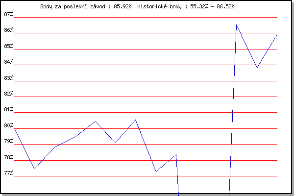 ZávodBodyVýkonnostZměna| 13.06.2007 | Pisárky Anthropos, 6.6 km | 79.95% | 79.94% | | | 20.06.2007 | Palackého vrch Běh Olympijského dne | 77.47% | 78.85% | -1.09% | | 11.07.2007 | Veselka, Popůvky Vintrovna, 7.9 km | 78.86% | 79.00% | +0.15% | | 25.07.2007 | Pisárky Anthropos, 6.6 km | 79.46% | 79.32% | +0.32% | | 11.06.2008 | Pisárky Anthropos, 6.3 km | 80.47% | 79.81% | +0.49% | | 13.05.2009 | Pisárky Anthropos, 6.3 km | 79.09% | 79.62% | -0.19% | | 29.07.2009 | Obřany, 8.8 km | 80.56% | 79.97% | +0.35% | | 28.07.2010 | Pisárky Anthropos, 6.3 km | 77.29% | 79.52% | -0.45% | | 29.08.2012 | Pisárky Anthropos, 6 km | 78.37% | 79.32% | -0.20% | | 14.05.2014 | Pisárky Anthropos, 6 km | 56.01% | 78.33% | -0.99% | | 21.05.2014 | Palackého vrch, 7.1 km | 55.32% | 74.01% | -4.32% | | 28.09.2015 | Blažovice – Svatováclavský běh, 11 km | 86.52% | 78.38% | +4.37% | | 13.07.2016 | Atletický stadión Pod Palackého vrche | 83.83% | 80.85% | +2.47% | | 17.08.2016 | Líšeň, 11 km | 85.92% | 83.13% | +2.28% | | | | |