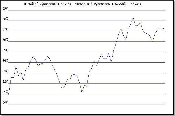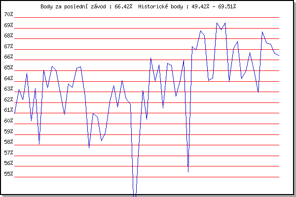 ZávodBodyVýkonnostZměna| 13.05.2009 | Pisárky Anthropos, 6.3 km | 60.95% | 60.95% | | | 10.06.2009 | Pisárky Anthropos, 6.3 km | 63.23% | 62.55% | +1.60% | | 24.06.2009 | Palackého vrch Běh Olympijského dne | 62.25% | 62.55% | 0.00% | | 15.07.2009 | Pisárky Anthropos, 6.3 km | 64.75% | 63.58% | +1.03% | | 22.07.2009 | Moravská Slavia dráha, 15 km | 60.28% | 62.76% | -0.82% | | 05.08.2009 | Líšeň Mariánské údolí, 11.1 km | 63.35% | 63.13% | +0.37% | | 12.08.2009 | Veselka, Popůvky Vintrovna, 7.9 km | 58.09% | 62.28% | -0.85% | | 19.08.2009 | Moravská Slavia dráha, 10 km | 65.03% | 63.34% | +1.06% | | 28.09.2009 | Blažovice Svatováclavský běh, 11 km | 63.40% | 63.53% | +0.19% | | 12.05.2010 | Pisárky Anthropos, 6.3 km | 65.43% | 64.23% | +0.70% | | 26.05.2010 | Obřany, 8.8 km | 65.03% | 64.58% | +0.35% | | 16.06.2010 | Pisárky Anthropos, 6.3 km | 63.09% | 64.27% | -0.31% | | 21.07.2010 | Moravská Slavia dráha, 5 km | 60.90% | 63.69% | -0.58% | | 28.07.2010 | Pisárky Anthropos, 6.3 km | 63.76% | 63.85% | +0.16% | | 04.08.2010 | Palackého vrch , 7.1 km | 63.44% | 63.89% | +0.04% | | 11.08.2010 | Obřany, 8.8 km | 65.21% | 64.28% | +0.39% | | 18.08.2010 | Moravská Slavia dráha, 10 km | 65.35% | 64.62% | +0.34% | | 11.05.2011 | Pisárky Anthropos, 6 km | 62.60% | 64.24% | -0.38% | | 18.05.2011 | Palackého vrch, 7.1 km | 57.73% | 63.68% | -0.56% | | 15.06.2011 | Pisárky Anthropos, 6 km | 60.96% | 63.19% | -0.49% | | 07.09.2011 | Pisárky Anthropos, 6 km | 60.63% | 62.69% | -0.50% | | 21.09.2011 | AC Moravská Slávia Brno, 1hod atlet | 58.44% | 61.98% | -0.71% | | 16.05.2012 | Palackého vrch, 7.1 km | 59.11% | 61.45% | -0.53% | | 23.05.2012 | Obřany, 8.8 km | 62.06% | 61.75% | +0.30% | | 30.05.2012 | Líšeň Mariánské údolí, 11 km | 63.61% | 62.35% | +0.60% | | 20.06.2012 | Palackého vrch – Běh Olympijského dne | 61.58% | 62.31% | -0.04% | | 27.06.2012 | Obřany, 8.8 km | 64.07% | 62.89% | +0.58% | | 18.07.2012 | Atletický stadión Pod Palackého vrche | 62.36% | 62.86% | -0.03% | | 25.07.2012 | Pisárky Anthropos, 6 km | 61.86% | 62.70% | -0.16% | | 01.08.2012 | Palackého vrch, 7.1 km | 49.42% | 62.08% | -0.62% | | 08.08.2012 | Obřany, 8.8 km | 57.23% | 61.14% | -0.94% | | 16.07.2014 | Atletický stadión Pod Palackého vrche | 63.14% | 61.84% | +0.70% | | 30.07.2014 | Palackého vrch, 7.1 km | 60.42% | 61.71% | -0.13% | | 17.09.2014 | Pisárky Anthropos, 6 km | 66.19% | 63.06% | +1.35% | | 13.05.2015 | Pisárky Anthropos, 6 km | 64.03% | 63.46% | +0.40% | | 27.05.2015 | Obřany, 8.8 km | 65.57% | 64.14% | +0.68% | | 03.06.2015 | Líšeň, 11 km | 61.49% | 63.67% | -0.47% | | 17.06.2015 | Pisárky Anthropos, 6 km | 65.69% | 64.29% | +0.62% | | 01.07.2015 | Obřany, 8.8 km | 65.51% | 64.74% | +0.45% | | 12.08.2015 | Atletický stadión Pod Palackého vrche | 62.57% | 64.36% | -0.38% | | 19.08.2015 | Líšeň, 10.6 km | 63.93% | 64.37% | +0.01% | | 02.09.2015 | Atletický stadión Pod Palackého vrche | 65.97% | 64.86% | +0.49% | | 16.09.2015 | Pisárky Anthropos, 6 km | 55.46% | 64.06% | -0.80% | | 20.04.2016 | Atletický stadión Pod Palackého vrche | 67.27% | 65.15% | +1.09% | | 27.04.2016 | Pisárky Anthropos, 6 km | 66.94% | 65.79% | +0.64% | | 04.05.2016 | Líšeň, 11 km | 68.76% | 66.70% | +0.91% | | 25.05.2016 | Obřany, 8.8 km | 68.28% | 67.27% | +0.57% | | 01.06.2016 | Líšeň, 11 km | 64.07% | 66.65% | -0.62% | | 15.06.2016 | Pisárky Anthropos, 6 km | 64.31% | 66.20% | -0.45% | | 13.07.2016 | Atletický stadión Pod Palackého vrche | 69.51% | 67.15% | +0.95% | | 20.07.2016 | Pisárky Anthropos, 6 km | 68.86% | 67.73% | +0.58% | | 03.08.2016 | Obřany, 8.8 km | 69.49% | 68.34% | +0.61% | | 24.05.2017 | Obřany, 8.8 km | 63.98% | 67.51% | -0.83% | | 31.05.2017 | Líšeň, 11 km | 67.07% | 67.57% | +0.06% | | 07.06.2017 | Pisárky Anthropos, 6 km | 67.75% | 67.79% | +0.22% | | 12.07.2017 | Atletický stadión Pod Palackého vrche | 64.26% | 67.10% | -0.69% | | 02.08.2017 | Líšeň, 11 km | 64.97% | 66.71% | -0.39% | | 16.08.2017 | Obřany, 8.8 km | 66.69% | 66.83% | +0.12% | | 30.08.2017 | Atletický stadión Pod Palackého vrche | 64.86% | 66.47% | -0.36% | | 25.04.2018 | Atletický stadión Pod Palackého vrche | 62.94% | 65.99% | -0.48% | | 23.05.2018 | Obřany, 8.8 km | 68.67% | 66.78% | +0.79% | | 30.05.2018 | Líšeň, 11 km | 67.58% | 67.11% | +0.33% | | 13.06.2018 | Atletický stadión Pod Palackého vrche | 67.50% | 67.33% | +0.22% | | 18.07.2018 | Obřany, 8.8 km | 66.61% | 67.28% | -0.05% | | 17.04.2019 | Atletický stadión Pod Palackého vrche | 66.42% | 67.18% | -0.10% | | | | |