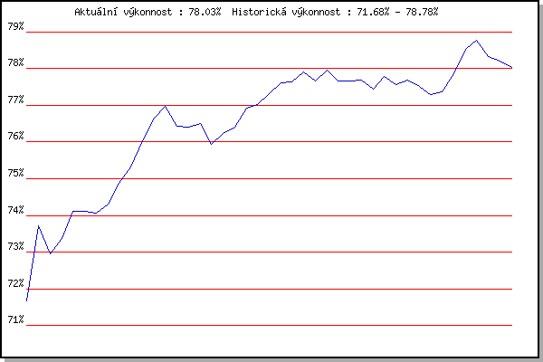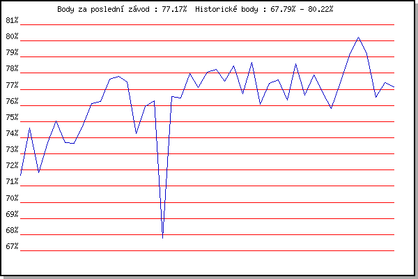 ZávodBodyVýkonnostZměna| 20.05.2009 | Obřany, 8.8 km | 71.68% | 71.68% | | | 10.06.2009 | Pisárky Anthropos, 6.3 km | 74.60% | 73.72% | +2.04% | | 22.07.2009 | Moravská Slavia dráha, 15 km | 71.82% | 72.96% | -0.76% | | 05.08.2009 | Líšeň Mariánské údolí, 11.1 km | 73.69% | 73.38% | +0.42% | | 19.08.2009 | Moravská Slavia dráha, 10 km | 75.02% | 74.11% | +0.73% | | 30.06.2010 | Obřany, 8.8 km | 73.70% | 74.12% | +0.01% | | 14.07.2010 | Veselka, Popůvky Vintrovna, 7.9 km | 73.67% | 74.05% | -0.07% | | 21.07.2010 | Moravská Slavia dráha, 5 km | 74.84% | 74.32% | +0.27% | | 28.07.2010 | Pisárky Anthropos, 6.3 km | 76.10% | 74.87% | +0.55% | | 04.08.2010 | Palackého vrch , 7.1 km | 76.23% | 75.32% | +0.45% | | 11.08.2010 | Obřany, 8.8 km | 77.61% | 76.04% | +0.72% | | 08.09.2010 | Pisárky Anthropos, 6.3 km | 77.82% | 76.65% | +0.61% | | 22.09.2010 | Moravská Slavia dráha, 15 km | 77.44% | 76.97% | +0.32% | | 11.05.2011 | Pisárky Anthropos, 6 km | 74.24% | 76.42% | -0.55% | | 18.05.2011 | Palackého vrch, 7.1 km | 75.96% | 76.41% | -0.01% | | 01.06.2011 | Líšeň Mariánské údolí, 11.1 km | 76.31% | 76.50% | +0.09% | | 08.06.2011 | Veselka, Popůvky Vintrovna, 7.9 km | 67.79% | 75.93% | -0.57% | | 15.06.2011 | Pisárky Anthropos, 6 km | 76.53% | 76.24% | +0.31% | | 23.06.2011 | Palackého vrch – Běh Olympijského dne | 76.48% | 76.41% | +0.17% | | 13.07.2011 | Popůvky, 7.9 km | 77.98% | 76.92% | +0.51% | | 20.07.2011 | AC Moravská Slávia, 5km atletický o | 77.10% | 77.02% | +0.10% | | 27.07.2011 | Pisárky Anthropos, 6 km | 78.04% | 77.32% | +0.30% | | 03.08.2011 | Palackého vrch, 7.1 km | 78.25% | 77.61% | +0.29% | | 17.08.2011 | AC Moravská Slávia, 10km atletický | 77.51% | 77.65% | +0.04% | | 24.08.2011 | Líšeň Mariánské údolí, 11.1 km | 78.43% | 77.90% | +0.25% | | 07.09.2011 | Pisárky Anthropos, 6 km | 76.74% | 77.67% | -0.23% | | 21.09.2011 | AC Moravská Slávia Brno, 1hod atlet | 78.65% | 77.97% | +0.30% | | 09.05.2012 | Pisárky Anthropos, 6 km | 76.07% | 77.66% | -0.31% | | 16.05.2012 | Palackého vrch, 7.1 km | 77.39% | 77.67% | +0.01% | | 23.05.2012 | Obřany, 8.8 km | 77.57% | 77.70% | +0.03% | | 13.06.2012 | Pisárky Anthropos, 6 km | 76.35% | 77.44% | -0.26% | | 11.07.2012 | Popůvky, 7.9 km | 78.59% | 77.78% | +0.34% | | 18.07.2012 | Atletický stadión Pod Palackého vrche | 76.64% | 77.57% | -0.21% | | 01.08.2012 | Palackého vrch, 7.1 km | 77.89% | 77.70% | +0.13% | | 05.06.2013 | Líšeň, 11 km | 76.75% | 77.52% | -0.18% | | 19.06.2013 | Pisárky Anthropos, 6 km | 75.80% | 77.29% | -0.23% | | 10.07.2013 | Popůvky, 7.3 km | 77.43% | 77.38% | +0.09% | | 07.08.2013 | Obřany, 8.8 km | 79.10% | 77.87% | +0.49% | | 21.08.2013 | Líšeň, 11 km | 80.22% | 78.52% | +0.65% | | 18.09.2013 | Pisárky Anthropos, 6 km | 79.20% | 78.78% | +0.26% | | 10.09.2014 | Líšeň, 11 km | 76.49% | 78.34% | -0.44% | | 17.09.2014 | Pisárky Anthropos, 6 km | 77.43% | 78.20% | -0.14% | | 13.05.2015 | Pisárky Anthropos, 6 km | 77.17% | 78.03% | -0.17% | | | | |