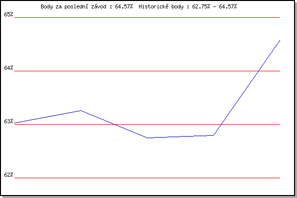 Závod| Body | Výkonnost | Změna | 10.06.2009 | Pisárky Anthropos, 6.3 km | 63.03% | 63.02% | | 24.06.2009 | Palackého vrch Běh Olympijského dne | 63.26% | 63.19% | +0.17% | 01.07.2009 | Líšeň Mariánské údolí, 11.1 km | 62.75% | 63.05% | -0.14% | 22.07.2009 | Moravská Slavia dráha, 15 km | 62.80% | 62.97% | -0.08% | 29.07.2009 | Obřany, 8.8 km | 64.57% | 63.58% | +0.61% | | |
