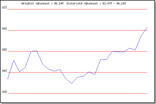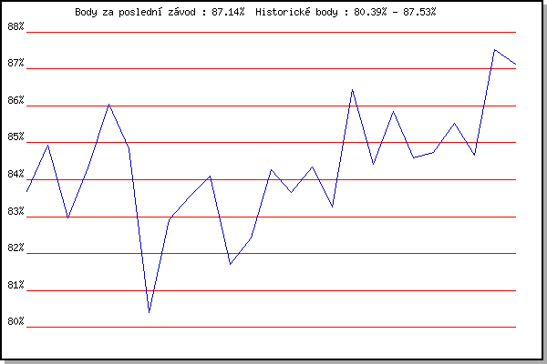 ZávodBodyVýkonnostZměna| 17.06.2009 | Obřany, 8.8 km | 83.69% | 83.69% | | | 01.07.2009 | Líšeň Mariánské údolí, 11.1 km | 84.95% | 84.57% | +0.88% | | 08.07.2009 | Veselka, Popůvky Vintrovna, 7.9 km | 82.96% | 84.02% | -0.55% | | 15.07.2009 | Pisárky Anthropos, 6.3 km | 84.33% | 84.24% | +0.22% | | 12.05.2010 | Pisárky Anthropos, 6.3 km | 86.04% | 85.00% | +0.76% | | 26.05.2010 | Obřany, 8.8 km | 84.83% | 85.03% | +0.03% | | 21.07.2010 | Moravská Slavia dráha, 5 km | 80.39% | 84.39% | -0.64% | | 28.07.2010 | Pisárky Anthropos, 6.3 km | 82.91% | 84.16% | -0.23% | | 11.08.2010 | Obřany, 8.8 km | 83.56% | 84.06% | -0.10% | | 18.08.2010 | Moravská Slavia dráha, 10 km | 84.11% | 84.14% | +0.08% | | 20.07.2011 | AC Moravská Slávia, 5km atletický o | 81.71% | 83.71% | -0.43% | | 18.07.2012 | Atletický stadión Pod Palackého vrche | 82.41% | 83.47% | -0.24% | | 19.09.2012 | Atletický stadión Pod Palackého vrche | 84.28% | 83.77% | +0.30% | | 29.05.2013 | Obřany, 8.8 km | 83.65% | 83.81% | +0.04% | | 03.07.2013 | Obřany, 8.8 km | 84.35% | 84.02% | +0.21% | | 24.07.2013 | Pisárky Anthropos, 6 km | 83.26% | 83.90% | -0.12% | | 07.08.2013 | Obřany, 8.8 km | 86.45% | 84.60% | +0.70% | | 14.08.2013 | Atletický stadión Pod Palackého vrche | 84.41% | 84.62% | +0.02% | | 28.05.2014 | Obřany, 8.8 km | 85.86% | 85.00% | +0.38% | | 27.05.2015 | Obřany, 8.8 km | 84.58% | 84.97% | -0.03% | | 01.07.2015 | Obřany, 8.8 km | 84.74% | 84.98% | +0.01% | | 15.07.2015 | Atletický stadión Pod Palackého vrche | 85.53% | 85.15% | +0.17% | | 02.09.2015 | Atletický stadión Pod Palackého vrche | 84.66% | 85.07% | -0.08% | | 03.08.2016 | Obřany, 8.8 km | 87.53% | 85.73% | +0.66% | | 31.08.2016 | Atletický stadión Pod Palackého vrche | 87.14% | 86.14% | +0.41% | | | | |
