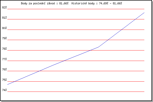 Závod| Body | Výkonnost | Změna | 05.08.2009 | Líšeň Mariánské údolí, 11.1 km | 74.69% | 74.69% | | 12.08.2009 | Veselka, Popůvky Vintrovna, 7.9 km | 76.56% | 75.99% | +1.30% | 28.09.2009 | Blažovice Svatováclavský běh, 11 km | 78.32% | 77.32% | +1.33% | 28.09.2012 | Blažovice – Svatováclavský běh, 11 km | 81.66% | 79.34% | +2.02% | | |