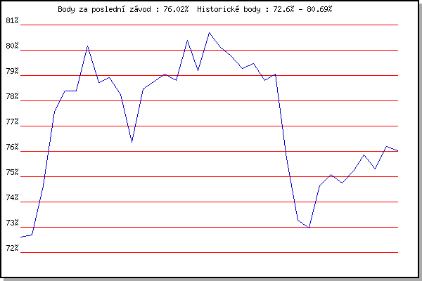 ZávodBodyVýkonnostZměna| 05.08.2009 | Líšeň Mariánské údolí, 11.1 km | 72.60% | 72.60% | | | 10.08.2011 | Obřany, 8.8 km | 72.70% | 72.67% | +0.07% | | 28.09.2011 | Blažovice – Svatováclavský běh , 11 k | 74.64% | 73.70% | +1.03% | | 14.05.2014 | Pisárky Anthropos, 6 km | 77.58% | 75.45% | +1.75% | | 21.05.2014 | Palackého vrch, 7.1 km | 78.38% | 76.75% | +1.30% | | 28.05.2014 | Obřany, 8.8 km | 78.38% | 77.58% | +0.83% | | 04.06.2014 | Líšeň, 11 km | 80.16% | 78.58% | +1.00% | | 11.06.2014 | Popůvky, 7.9 km | 78.71% | 78.82% | +0.24% | | 25.06.2014 | Palackého vrch – Běh Olympijského dne | 78.92% | 78.92% | +0.10% | | 09.07.2014 | Popůvky, 7.9 km | 78.24% | 78.78% | -0.14% | | 16.07.2014 | Atletický stadión Pod Palackého vrche | 76.37% | 78.38% | -0.40% | | 23.07.2014 | Pisárky Anthropos, 6 km | 78.46% | 78.50% | +0.12% | | 30.07.2014 | Palackého vrch, 7.1 km | 78.76% | 78.67% | +0.17% | | 06.08.2014 | Obřany, 8.8 km | 79.06% | 78.81% | +0.14% | | 13.08.2014 | Atletický stadión Pod Palackého vrche | 78.81% | 78.84% | +0.03% | | 20.08.2014 | Líšeň, 11 km | 80.40% | 79.27% | +0.43% | | 27.08.2014 | Popůvky, 5.3 km | 79.20% | 79.29% | +0.02% | | 10.09.2014 | Líšeň, 11 km | 80.69% | 79.69% | +0.40% | | 17.09.2014 | Pisárky Anthropos, 6 km | 80.11% | 79.84% | +0.15% | | 28.09.2014 | Blažovice – Svatováclavský běh, 11 km | 79.78% | 79.88% | +0.04% | | 13.05.2015 | Pisárky Anthropos, 6 km | 79.27% | 79.78% | -0.10% | | 27.05.2015 | Obřany, 8.8 km | 79.47% | 79.74% | -0.04% | | 10.06.2015 | Popůvky, 7.9 km | 78.81% | 79.56% | -0.18% | | 17.06.2015 | Pisárky Anthropos, 6 km | 79.06% | 79.47% | -0.09% | | 15.07.2015 | Atletický stadión Pod Palackého vrche | 75.71% | 79.28% | -0.19% | | 25.04.2018 | Atletický stadión Pod Palackého vrche | 73.29% | 78.57% | -0.71% | | 02.05.2018 | Hotel Myslivna, 7 km | 72.97% | 77.54% | -1.03% | | 09.05.2018 | Popůvky, 7.9 km | 74.63% | 77.03% | -0.51% | | 23.05.2018 | Obřany, 8.8 km | 75.09% | 76.73% | -0.30% | | 06.06.2018 | Pisárky Anthropos, 6 km | 74.76% | 76.39% | -0.34% | | 20.06.2018 | Palackého vrch, 7.1 km | 75.23% | 76.19% | -0.20% | | 27.06.2018 | Popůvky, 7.9 km | 75.85% | 76.18% | -0.01% | | 11.07.2018 | Hotel Myslivna, 7 km | 75.31% | 76.03% | -0.15% | | 01.08.2018 | Pisárky Anthropos, 6 km | 76.20% | 76.14% | +0.11% | | 15.08.2018 | Popůvky, 7.9 km | 76.02% | 76.16% | +0.02% | | | | |