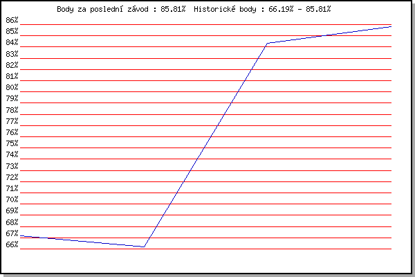 Závod| Body | Výkonnost | Změna | 12.08.2009 | Veselka, Popůvky Vintrovna, 7.9 km | 67.18% | 67.18% | | 24.07.2013 | Pisárky Anthropos, 6 km | 66.19% | 66.74% | -0.44% | 11.09.2013 | Líšeň, 11 km | 84.34% | 76.32% | +9.58% | 18.09.2013 | Pisárky Anthropos, 6 km | 85.81% | 81.23% | +4.91% | | |