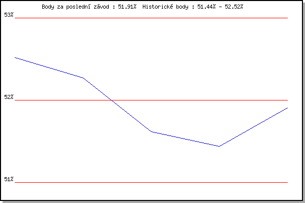 Závod| Body | Výkonnost | Změna | 28.09.2009 | Blažovice Svatováclavský běh, 11 km | 52.52% | 52.52% | | 28.09.2011 | Blažovice – Svatováclavský běh , 11 k | 52.27% | 52.41% | -0.11% | 28.09.2012 | Blažovice – Svatováclavský běh, 11 km | 51.62% | 52.18% | -0.23% | 28.09.2013 | Blažovice – Svatováclavský běh, 11 km | 51.44% | 51.96% | -0.22% | 28.09.2014 | Blažovice – Svatováclavský běh, 11 km | 51.91% | 51.98% | +0.02% | | |