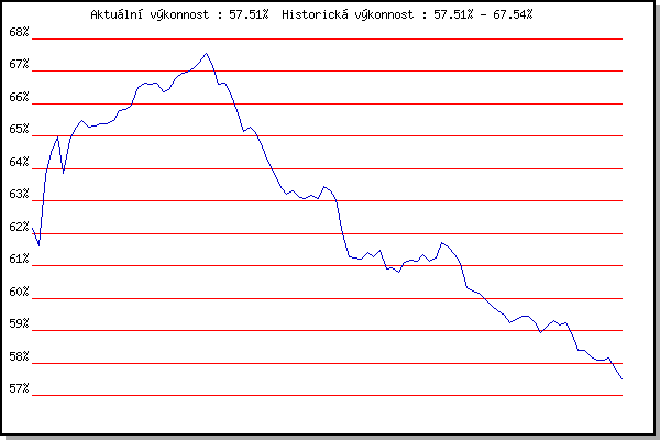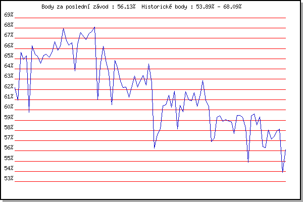 ZávodBodyVýkonnostZměna| 12.05.2010 | Pisárky Anthropos, 6.3 km | 62.16% | 62.16% | | | 19.05.2010 | Palackého vrch , 7.1 km | 60.95% | 61.63% | -0.53% | | 26.05.2010 | Obřany, 8.8 km | 65.64% | 63.78% | +2.15% | | 02.06.2010 | Líšeň Mariánské údolí, 11.1 km | 64.96% | 64.51% | +0.73% | | 09.06.2010 | Veselka, Popůvky Vintrovna, 7.9 km | 65.30% | 64.99% | +0.48% | | 16.06.2010 | Pisárky Anthropos, 6.3 km | 59.78% | 63.87% | -1.12% | | 07.07.2010 | Líšeň Mariánské údolí, 11.1 km | 66.27% | 64.89% | +1.02% | | 14.07.2010 | Veselka, Popůvky Vintrovna, 7.9 km | 65.44% | 65.28% | +0.39% | | 21.07.2010 | Moravská Slavia dráha, 5 km | 65.24% | 65.47% | +0.19% | | 28.07.2010 | Pisárky Anthropos, 6.3 km | 64.55% | 65.28% | -0.19% | | 04.08.2010 | Palackého vrch , 7.1 km | 65.34% | 65.33% | +0.05% | | 11.08.2010 | Obřany, 8.8 km | 65.42% | 65.40% | +0.07% | | 01.09.2010 | Veselka, Popůvky Vintrovna, 7.9 km | 65.16% | 65.37% | -0.03% | | 08.09.2010 | Pisárky Anthropos, 6.3 km | 65.67% | 65.47% | +0.10% | | 22.09.2010 | Moravská Slavia dráha, 15 km | 66.66% | 65.80% | +0.33% | | 28.09.2010 | Blažovice Svatováclavský běh, 9.4 km | 65.86% | 65.84% | +0.04% | | 09.10.2010 | Mizuno sedmička, 7 km | 66.21% | 65.97% | +0.13% | | 11.05.2011 | Pisárky Anthropos, 6 km | 67.95% | 66.51% | +0.54% | | 25.05.2011 | Obřany, 8.8 km | 66.79% | 66.63% | +0.12% | | 01.06.2011 | Líšeň Mariánské údolí, 11.1 km | 66.33% | 66.62% | -0.01% | | 15.06.2011 | Pisárky Anthropos, 6 km | 66.57% | 66.65% | +0.03% | | 23.06.2011 | Palackého vrch – Běh Olympijského dne | 63.83% | 66.37% | -0.28% | | 29.06.2011 | Obřany, 8.8 km | 66.38% | 66.45% | +0.08% | | 13.07.2011 | Popůvky, 7.9 km | 67.58% | 66.79% | +0.34% | | 20.07.2011 | AC Moravská Slávia, 5km atletický o | 67.19% | 66.95% | +0.16% | | 27.07.2011 | Pisárky Anthropos, 6 km | 66.88% | 66.97% | +0.02% | | 03.08.2011 | Palackého vrch, 7.1 km | 67.46% | 67.13% | +0.16% | | 10.08.2011 | Obřany, 8.8 km | 67.64% | 67.29% | +0.16% | | 17.08.2011 | AC Moravská Slávia, 10km atletický | 68.09% | 67.54% | +0.25% | | 24.08.2011 | Líšeň Mariánské údolí, 11.1 km | 61.00% | 67.15% | -0.39% | | 31.08.2011 | Popůvky, 7.9 km | 64.26% | 66.60% | -0.55% | | 21.09.2011 | AC Moravská Slávia Brno, 1hod atlet | 66.24% | 66.63% | +0.03% | | 28.09.2011 | Blažovice – Svatováclavský běh , 11 k | 64.60% | 66.24% | -0.39% | | 09.05.2012 | Pisárky Anthropos, 6 km | 63.63% | 65.78% | -0.46% | | 16.05.2012 | Palackého vrch, 7.1 km | 60.49% | 65.15% | -0.63% | | 23.05.2012 | Obřany, 8.8 km | 64.84% | 65.27% | +0.12% | | 30.05.2012 | Líšeň Mariánské údolí, 11 km | 64.15% | 65.11% | -0.16% | | 06.06.2012 | Popůvky, 7.9 km | 62.81% | 64.68% | -0.43% | | 27.06.2012 | Obřany, 8.8 km | 62.20% | 64.23% | -0.45% | | 11.07.2012 | Popůvky, 7.9 km | 62.22% | 63.84% | -0.39% | | 18.07.2012 | Atletický stadión Pod Palackého vrche | 61.26% | 63.43% | -0.41% | | 25.07.2012 | Pisárky Anthropos, 6 km | 62.16% | 63.22% | -0.21% | | 08.08.2012 | Obřany, 8.8 km | 63.30% | 63.31% | +0.09% | | 29.08.2012 | Pisárky Anthropos, 6 km | 62.25% | 63.10% | -0.21% | | 05.09.2012 | Popůvky, 7.9 km | 62.81% | 63.07% | -0.03% | | 24.07.2013 | Pisárky Anthropos, 6 km | 63.36% | 63.19% | +0.12% | | 07.08.2013 | Obřany, 8.8 km | 62.45% | 63.06% | -0.13% | | 14.08.2013 | Atletický stadión Pod Palackého vrche | 64.51% | 63.46% | +0.40% | | 28.09.2014 | Blažovice – Svatováclavský běh, 11 km | 62.65% | 63.32% | -0.14% | | 20.04.2016 | Atletický stadión Pod Palackého vrche | 56.26% | 63.05% | -0.27% | | 27.04.2016 | Pisárky Anthropos, 6 km | 57.61% | 62.00% | -1.05% | | 04.05.2016 | Líšeň, 11 km | 58.12% | 61.27% | -0.73% | | 11.05.2016 | Popůvky, 7.9 km | 60.40% | 61.23% | -0.04% | | 18.05.2016 | Palackého vrch, 7.1 km | 60.51% | 61.21% | -0.02% | | 25.05.2016 | Obřany, 8.8 km | 61.44% | 61.42% | +0.21% | | 01.06.2016 | Líšeň, 11 km | 60.24% | 61.29% | -0.13% | | 08.06.2016 | Popůvky, 7.9 km | 61.84% | 61.48% | +0.19% | | 15.06.2016 | Pisárky Anthropos, 6 km | 58.12% | 60.91% | -0.57% | | 22.06.2016 | Palackého vrch Běh Olympijského dne | 60.48% | 60.93% | +0.02% | | 29.06.2016 | Obřany, 8.8 km | 59.83% | 60.80% | -0.13% | | 13.07.2016 | Atletický stadión Pod Palackého vrche | 61.81% | 61.11% | +0.31% | | 20.07.2016 | Pisárky Anthropos, 6 km | 61.00% | 61.16% | +0.05% | | 27.07.2016 | Palackého vrch, 7.1 km | 60.88% | 61.15% | -0.01% | | 03.08.2016 | Obřany, 8.8 km | 61.69% | 61.34% | +0.19% | | 10.08.2016 | Hotel Myslivna, 7 km | 60.37% | 61.14% | -0.20% | | 17.08.2016 | Líšeň, 11 km | 61.42% | 61.25% | +0.11% | | 24.08.2016 | Popůvky, 7.9 km | 62.89% | 61.71% | +0.46% | | 31.08.2016 | Atletický stadión Pod Palackého vrche | 60.92% | 61.58% | -0.13% | | 07.09.2016 | Pisárky Anthropos, 6 km | 60.38% | 61.34% | -0.24% | | 17.05.2017 | Palackého vrch, 7.1 km | 56.91% | 61.07% | -0.27% | | 24.05.2017 | Obřany, 8.8 km | 57.24% | 60.32% | -0.75% | | 31.05.2017 | Líšeň, 11 km | 59.27% | 60.21% | -0.11% | | 14.06.2017 | Popůvky, 7.9 km | 59.44% | 60.17% | -0.04% | | 21.06.2017 | Palackého vrch, 7.1 km | 58.87% | 59.97% | -0.20% | | 28.06.2017 | Obřany, 8.8 km | 59.06% | 59.79% | -0.18% | | 12.07.2017 | Atletický stadión Pod Palackého vrche | 58.94% | 59.62% | -0.17% | | 19.07.2017 | Pisárky Anthropos, 6 km | 58.82% | 59.47% | -0.15% | | 26.07.2017 | Palackého vrch, 7.1 km | 57.67% | 59.23% | -0.24% | | 02.08.2017 | Líšeň, 11 km | 59.46% | 59.36% | +0.13% | | 09.08.2017 | Hotel Myslivna, 7 km | 59.47% | 59.45% | +0.09% | | 16.08.2017 | Obřany, 8.8 km | 59.27% | 59.43% | -0.02% | | 30.08.2017 | Atletický stadión Pod Palackého vrche | 58.22% | 59.23% | -0.20% | | 25.04.2018 | Atletický stadión Pod Palackého vrche | 54.87% | 58.95% | -0.28% | | 02.05.2018 | Hotel Myslivna, 7 km | 59.40% | 59.14% | +0.19% | | 09.05.2018 | Popůvky, 7.9 km | 59.61% | 59.32% | +0.18% | | 16.05.2018 | Palackého vr