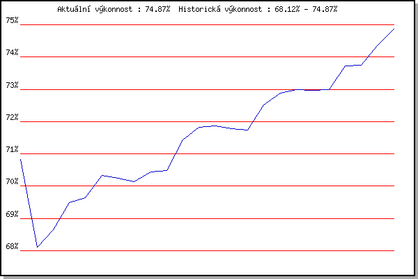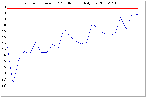 ZávodBodyVýkonnostZměna| 12.05.2010 | Pisárky Anthropos, 6.3 km | 70.83% | 70.83% | | | 09.10.2010 | Mizuno sedmička, 7 km | 64.59% | 68.12% | -2.71% | | 15.06.2011 | Pisárky Anthropos, 6 km | 68.44% | 68.64% | +0.52% | | 23.06.2011 | Palackého vrch – Běh Olympijského dne | 69.89% | 69.50% | +0.86% | | 27.07.2011 | Pisárky Anthropos, 6 km | 69.53% | 69.64% | +0.14% | | 03.08.2011 | Palackého vrch, 7.1 km | 71.43% | 70.33% | +0.69% | | 10.08.2011 | Obřany, 8.8 km | 69.72% | 70.24% | -0.09% | | 13.06.2012 | Pisárky Anthropos, 6 km | 69.75% | 70.14% | -0.10% | | 11.07.2012 | Popůvky, 7.9 km | 71.10% | 70.45% | +0.31% | | 18.07.2012 | Atletický stadión Pod Palackého vrche | 70.44% | 70.49% | +0.04% | | 25.07.2012 | Pisárky Anthropos, 6 km | 73.75% | 71.44% | +0.95% | | 01.08.2012 | Palackého vrch, 7.1 km | 72.51% | 71.82% | +0.38% | | 08.08.2012 | Obřany, 8.8 km | 71.64% | 71.87% | +0.05% | | 22.08.2012 | Líšeň Mariánské údolí, 11 km | 71.17% | 71.78% | -0.09% | | 05.09.2012 | Popůvky, 7.9 km | 71.33% | 71.74% | -0.04% | | 05.06.2013 | Líšeň, 11 km | 74.52% | 72.51% | +0.77% | | 12.06.2013 | Popůvky, 7.3 km | 73.72% | 72.88% | +0.37% | | 10.07.2013 | Popůvky, 7.3 km | 72.91% | 72.98% | +0.10% | | 17.07.2013 | Atletický stadión Pod Palackého vrche | 72.58% | 72.97% | -0.01% | | 18.09.2013 | Pisárky Anthropos, 6 km | 72.78% | 73.00% | +0.03% | | 09.07.2014 | Popůvky, 7.9 km | 75.56% | 73.72% | +0.72% | | 16.07.2014 | Atletický stadión Pod Palackého vrche | 73.57% | 73.75% | +0.03% | | 13.08.2014 | Atletický stadión Pod Palackého vrche | 75.94% | 74.36% | +0.61% | | 17.09.2014 | Pisárky Anthropos, 6 km | 76.02% | 74.87% | +0.51% | | | | |
