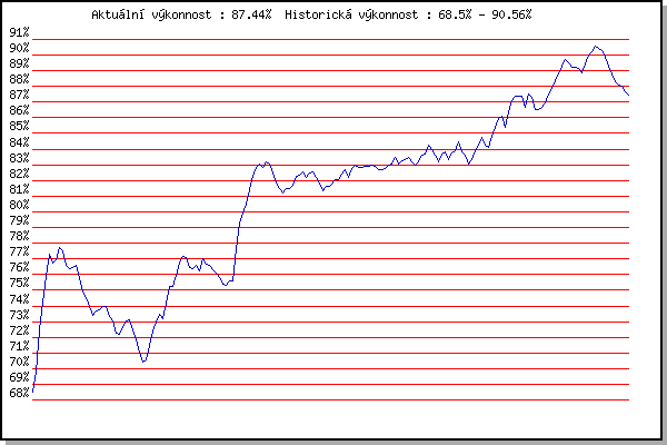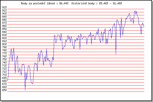 ZávodBodyVýkonnostZměna| 26.05.2010 | Obřany, 8.8 km | 68.49% | 68.50% | | | 02.06.2010 | Líšeň Mariánské údolí, 11.1 km | 70.34% | 69.79% | +1.29% | | 23.06.2010 | Palackého vrch Běh Olympijského dne | 74.71% | 72.48% | +2.69% | | 30.06.2010 | Obřany, 8.8 km | 75.93% | 74.22% | +1.74% | | 07.07.2010 | Líšeň Mariánské údolí, 11.1 km | 77.91% | 75.89% | +1.67% | | 14.07.2010 | Veselka, Popůvky Vintrovna, 7.9 km | 79.06% | 77.33% | +1.44% | | 21.07.2010 | Moravská Slavia dráha, 5 km | 74.84% | 76.72% | -0.61% | | 28.07.2010 | Pisárky Anthropos, 6.3 km | 77.09% | 76.95% | +0.23% | | 04.08.2010 | Palackého vrch , 7.1 km | 79.33% | 77.76% | +0.81% | | 11.08.2010 | Obřany, 8.8 km | 76.41% | 77.54% | -0.22% | | 18.08.2010 | Moravská Slavia dráha, 10 km | 70.94% | 76.62% | -0.92% | | 25.08.2010 | Líšeň Mariánské údolí, 11.1 km | 74.70% | 76.41% | -0.21% | | 01.09.2010 | Veselka, Popůvky Vintrovna, 7.9 km | 76.00% | 76.43% | +0.02% | | 08.09.2010 | Pisárky Anthropos, 6.3 km | 76.72% | 76.60% | +0.17% | | 22.09.2010 | Moravská Slavia dráha, 15 km | 71.45% | 75.77% | -0.83% | | 11.05.2011 | Pisárky Anthropos, 6 km | 71.46% | 74.90% | -0.87% | | 18.05.2011 | Palackého vrch, 7.1 km | 72.76% | 74.53% | -0.37% | | 25.05.2011 | Obřany, 8.8 km | 71.64% | 73.97% | -0.56% | | 01.06.2011 | Líšeň Mariánské údolí, 11.1 km | 70.36% | 73.42% | -0.55% | | 08.06.2011 | Veselka, Popůvky Vintrovna, 7.9 km | 73.96% | 73.69% | +0.27% | | 15.06.2011 | Pisárky Anthropos, 6 km | 73.64% | 73.78% | +0.09% | | 13.07.2011 | Popůvky, 7.9 km | 74.11% | 73.98% | +0.20% | | 20.07.2011 | AC Moravská Slávia, 5km atletický o | 73.42% | 73.96% | -0.02% | | 03.08.2011 | Palackého vrch, 7.1 km | 65.46% | 73.36% | -0.60% | | 10.08.2011 | Obřany, 8.8 km | 71.45% | 73.04% | -0.32% | | 17.08.2011 | AC Moravská Slávia, 10km atletický | 68.83% | 72.27% | -0.77% | | 24.08.2011 | Líšeň Mariánské údolí, 11.1 km | 71.21% | 72.17% | -0.10% | | 31.08.2011 | Popůvky, 7.9 km | 73.33% | 72.63% | +0.46% | | 07.09.2011 | Pisárky Anthropos, 6 km | 73.67% | 73.01% | +0.38% | | 14.09.2011 | Líšeň Mariánské údolí, 11.1 km | 73.04% | 73.11% | +0.10% | | 21.09.2011 | AC Moravská Slávia Brno, 1hod atlet | 69.65% | 72.51% | -0.60% | | 16.05.2012 | Palackého vrch, 7.1 km | 68.02% | 71.83% | -0.68% | | 23.05.2012 | Obřany, 8.8 km | 67.63% | 71.07% | -0.76% | | 30.05.2012 | Líšeň Mariánské údolí, 11 km | 67.50% | 70.39% | -0.68% | | 06.06.2012 | Popůvky, 7.9 km | 70.46% | 70.55% | +0.16% | | 13.06.2012 | Pisárky Anthropos, 6 km | 73.62% | 71.47% | +0.92% | | 20.06.2012 | Palackého vrch – Běh Olympijského dne | 74.47% | 72.42% | +0.95% | | 27.06.2012 | Obřany, 8.8 km | 73.89% | 72.99% | +0.57% | | 11.07.2012 | Popůvky, 7.9 km | 74.13% | 73.47% | +0.48% | | 18.07.2012 | Atletický stadión Pod Palackého vrche | 71.56% | 73.15% | -0.32% | | 25.07.2012 | Pisárky Anthropos, 6 km | 76.82% | 74.21% | +1.06% | | 01.08.2012 | Palackého vrch, 7.1 km | 77.64% | 75.21% | +1.00% | | 15.08.2012 | Atletický stadión Pod Palackého vrche | 74.68% | 75.26% | +0.05% | | 22.08.2012 | Líšeň Mariánské údolí, 11 km | 77.41% | 75.95% | +0.69% | | 29.08.2012 | Pisárky Anthropos, 6 km | 78.58% | 76.73% | +0.78% | | 05.09.2012 | Popůvky, 7.9 km | 77.84% | 77.15% | +0.42% | | 12.09.2012 | Líšeň Mariánské údolí, 11 km | 76.29% | 77.08% | -0.07% | | 19.09.2012 | Atletický stadión Pod Palackého vrche | 73.48% | 76.42% | -0.66% | | 28.09.2012 | Blažovice – Svatováclavský běh, 11 km | 75.79% | 76.41% | -0.01% | | 29.05.2013 | Obřany, 8.8 km | 76.50% | 76.57% | +0.16% | | 05.06.2013 | Líšeň, 11 km | 74.75% | 76.22% | -0.35% | | 19.06.2013 | Pisárky Anthropos, 6 km | 79.10% | 77.03% | +0.81% | | 26.06.2013 | Palackého vrch – Běh Olympijského dne | 75.22% | 76.69% | -0.34% | | 10.07.2013 | Popůvky, 7.3 km | 75.99% | 76.62% | -0.07% | | 24.07.2013 | Pisárky Anthropos, 6 km | 75.05% | 76.31% | -0.31% | | 31.07.2013 | Palackého vrch, 7.1 km | 75.31% | 76.12% | -0.19% | | 07.08.2013 | Obřany, 8.8 km | 73.69% | 75.81% | -0.31% | | 14.08.2013 | Atletický stadión Pod Palackého vrche | 73.09% | 75.38% | -0.43% | | 04.09.2013 | Atletický stadión Pod Palackého vrche | 74.60% | 75.28% | -0.10% | | 11.09.2013 | Líšeň, 11 km | 76.37% | 75.63% | +0.35% | | 18.09.2013 | Pisárky Anthropos, 6 km | 75.26% | 75.63% | 0.00% | | 14.05.2014 | Pisárky Anthropos, 6 km | 83.30% | 77.67% | +2.04% | | 21.05.2014 | Palackého vrch, 7.1 km | 83.45% | 79.30% | +1.63% | | 28.05.2014 | Obřany, 8.8 km | 80.91% | 79.92% | +0.62% | | 04.06.2014 | Líšeň, 11 km | 81.22% | 80.48% | +0.56% | | 18.06.2014 | Pisárky Anthropos, 6 km | 83.25% | 81.43% | +0.95% | | 25.06.2014 | Palackého vrch – Běh Olympijského dne | 83.66% | 82.27% | +0.84% | | 02.07.2014 | Obřany, 8.8 km | 83.45% | 82.86% | +0.59% | | 09.07.2014 | Popůvky, 7.9 km | 83.29% | 83.08% | +0.22% | | 16.07.2014 | Atletický stadión Pod Palackého vrche | 81.58% | 82.81% | -0.27% | | 23.07.2014 | Pisárky Anthropos, 6 km | 84.08% | 83.21% | +0.40% | | 27.08.2014 | Popůvky, 5.3 km | 82.11% | 83.02% | -0.19% | | 03.09.2014 | Atletický stadión Pod Palackého vrche | 78.69% | 82.46% | -0.56% | | 10.09.2014 | Líšeň, 11 km | 79.20% | 81.84% | -0.62% | | 17.09.2014 | Pisárky Anthropos, 6 km | 79.83% | 81.48% | -0.36% | | 13.05.2015 | Pisárky Anthropos, 6 km | 79.77% | 81.17% | -0.31% | | 20.05.2015 | Palackého vrch, 7.1 km | 81.93% | 81.46% | +0.29% | | 27.05.2015 | Obřany, 8.8 km | 81.23% | 81.49% | +0.03% | | 03.06.2015 | Líšeň, 11 km | 82.00% | 81.70% | +0.21% | | 10.06.2015 | Popůvky, 7.9 km | 83.48% | 82.24% | +0.54% | | 17.06.2015 | Pisárky Anthropos, 6 km | 82.14% | 82.33% | +0.09% | | 24.06.2015 | Palackého vrch, 7.1 km | 82.89% | 82.53% | +0.20% | | 01.07.2015 | Obřany, 8.8 km | 80.88% | 82.22% | -0.31% | | 08.07.2015 | Popůvky, 7.9 km | 83.05% | 82.50% | +0.28% | | 15.07.2015 | Atletický stadi