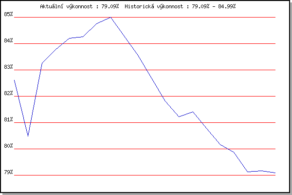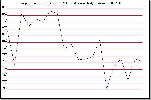 ZávodBodyVýkonnostZměna| 30.06.2010 | Obřany, 8.8 km | 82.61% | 82.61% | | | 08.09.2010 | Pisárky Anthropos, 6.3 km | 77.73% | 80.48% | -2.13% | | 10.08.2011 | Obřany, 8.8 km | 85.31% | 83.25% | +2.77% | | 30.05.2012 | Líšeň Mariánské údolí, 11 km | 83.41% | 83.77% | +0.52% | | 13.06.2012 | Pisárky Anthropos, 6 km | 84.52% | 84.21% | +0.44% | | 20.06.2012 | Palackého vrch – Běh Olympijského dne | 84.02% | 84.25% | +0.04% | | 27.06.2012 | Obřany, 8.8 km | 85.66% | 84.75% | +0.50% | | 08.08.2012 | Obřany, 8.8 km | 85.30% | 84.99% | +0.24% | | 17.06.2015 | Pisárky Anthropos, 6 km | 80.00% | 84.27% | -0.72% | | 01.07.2015 | Obřany, 8.8 km | 80.80% | 83.55% | -0.72% | | 19.08.2015 | Líšeň, 10.6 km | 78.45% | 82.69% | -0.86% | | 01.06.2016 | Líšeň, 11 km | 78.54% | 81.82% | -0.87% | | 15.06.2016 | Pisárky Anthropos, 6 km | 78.86% | 81.22% | -0.60% | | 29.06.2016 | Obřany, 8.8 km | 81.42% | 81.41% | +0.19% | | 02.08.2017 | Líšeň, 11 km | 74.07% | 80.77% | -0.64% | | 16.05.2018 | Palackého vrch, 7.1 km | 77.63% | 80.16% | -0.61% | | 23.05.2018 | Obřany, 8.8 km | 78.53% | 79.87% | -0.29% | | 05.06.2019 | Palackého vrch, 7.1 km | 75.48% | 79.14% | -0.73% | | 03.07.2019 | Obřany, 8.8 km | 78.55% | 79.17% | +0.03% | | 10.07.2019 | Hotel Myslivna, 7 km | 78.18% | 79.09% | -0.08% | | | | |