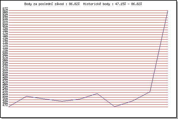 ZávodBodyVýkonnostZměna| 14.07.2010 | Veselka, Popůvky Vintrovna, 7.9 km | 47.15% | 47.15% | | | 28.07.2010 | Pisárky Anthropos, 6.3 km | 51.42% | 50.15% | +3.00% | | 20.06.2012 | Palackého vrch – Běh Olympijského dne | 50.29% | 50.53% | +0.38% | | 11.07.2012 | Popůvky, 7.9 km | 49.39% | 50.25% | -0.28% | | 22.08.2012 | Líšeň Mariánské údolí, 11 km | 50.19% | 50.30% | +0.05% | | 29.08.2012 | Pisárky Anthropos, 6 km | 52.56% | 51.13% | +0.83% | | 10.07.2013 | Popůvky, 7.3 km | 47.19% | 50.38% | -0.75% | | 07.08.2013 | Obřany, 8.8 km | 49.45% | 50.29% | -0.09% | | 21.08.2013 | Líšeň, 11 km | 53.27% | 51.30% | +1.01% | | 08.07.2020 | Pisárky Anthropos, 6 km | 86.82% | 63.38% | +12.08% | | | | |