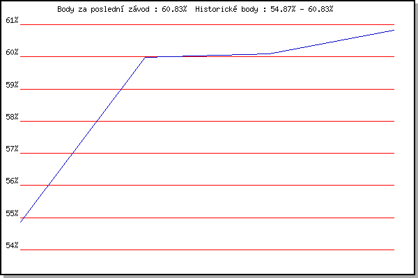 Závod| Body | Výkonnost | Změna | 14.07.2010 | Veselka, Popůvky Vintrovna, 7.9 km | 54.87% | 54.87% | | 14.05.2014 | Pisárky Anthropos, 6 km | 59.99% | 58.47% | +3.60% | 21.05.2014 | Palackého vrch, 7.1 km | 60.10% | 59.67% | +1.20% | 28.05.2014 | Obřany, 8.8 km | 60.83% | 60.38% | +0.71% | | |