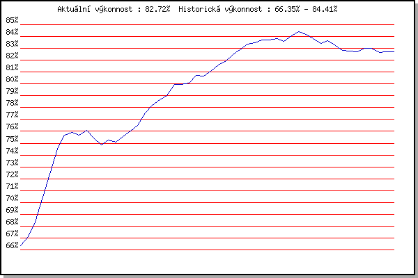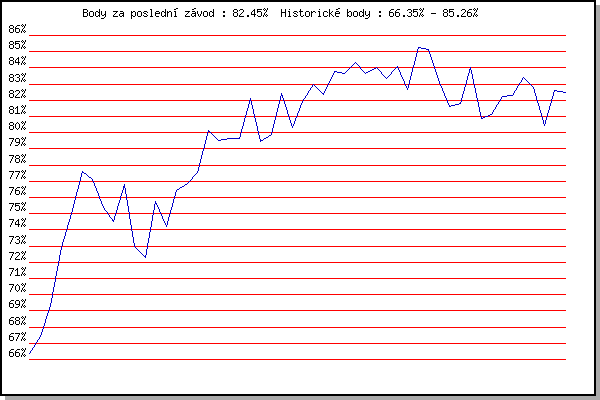 ZávodBodyVýkonnostZměna| 21.07.2010 | Moravská Slavia dráha, 5 km | 66.35% | 66.35% | | | 28.07.2010 | Pisárky Anthropos, 6.3 km | 67.42% | 67.09% | +0.74% | | 11.08.2010 | Obřany, 8.8 km | 69.34% | 68.33% | +1.24% | | 25.08.2010 | Líšeň Mariánské údolí, 11.1 km | 72.93% | 70.44% | +2.11% | | 01.09.2010 | Veselka, Popůvky Vintrovna, 7.9 km | 75.00% | 72.38% | +1.94% | | 08.09.2010 | Pisárky Anthropos, 6.3 km | 77.62% | 74.52% | +2.14% | | 22.09.2010 | Moravská Slavia dráha, 15 km | 77.12% | 75.66% | +1.14% | | 11.05.2011 | Pisárky Anthropos, 6 km | 75.39% | 75.91% | +0.25% | | 25.05.2011 | Obřany, 8.8 km | 74.54% | 75.68% | -0.23% | | 01.06.2011 | Líšeň Mariánské údolí, 11.1 km | 76.79% | 76.10% | +0.42% | | 13.07.2011 | Popůvky, 7.9 km | 72.99% | 75.47% | -0.63% | | 17.08.2011 | AC Moravská Slávia, 10km atletický | 72.29% | 74.87% | -0.60% | | 31.08.2011 | Popůvky, 7.9 km | 75.76% | 75.24% | +0.37% | | 07.09.2011 | Pisárky Anthropos, 6 km | 74.20% | 75.10% | -0.14% | | 21.09.2011 | AC Moravská Slávia Brno, 1hod atlet | 76.44% | 75.56% | +0.46% | | 09.05.2012 | Pisárky Anthropos, 6 km | 76.87% | 76.02% | +0.46% | | 16.05.2012 | Palackého vrch, 7.1 km | 77.52% | 76.50% | +0.48% | | 30.05.2012 | Líšeň Mariánské údolí, 11 km | 80.14% | 77.56% | +1.06% | | 06.06.2012 | Popůvky, 7.9 km | 79.53% | 78.20% | +0.64% | | 13.06.2012 | Pisárky Anthropos, 6 km | 79.62% | 78.69% | +0.49% | | 27.06.2012 | Obřany, 8.8 km | 79.63% | 79.04% | +0.35% | | 11.07.2012 | Popůvky, 7.9 km | 82.11% | 79.94% | +0.90% | | 18.07.2012 | Atletický stadión Pod Palackého vrche | 79.43% | 79.97% | +0.03% | | 08.08.2012 | Obřany, 8.8 km | 79.86% | 80.06% | +0.09% | | 22.08.2012 | Líšeň Mariánské údolí, 11 km | 82.39% | 80.69% | +0.63% | | 29.08.2012 | Pisárky Anthropos, 6 km | 80.31% | 80.66% | -0.03% | | 12.09.2012 | Líšeň Mariánské údolí, 11 km | 81.95% | 81.04% | +0.38% | | 15.05.2013 | Pisárky Anthropos, 6 km | 82.96% | 81.60% | +0.56% | | 22.05.2013 | Palackého vrch, 7.1 km | 82.36% | 81.89% | +0.29% | | 12.06.2013 | Popůvky, 7.3 km | 83.78% | 82.47% | +0.58% | | 19.06.2013 | Pisárky Anthropos, 6 km | 83.62% | 82.87% | +0.40% | | 26.06.2013 | Palackého vrch – Běh Olympijského dne | 84.33% | 83.36% | +0.49% | | 03.07.2013 | Obřany, 8.8 km | 83.66% | 83.50% | +0.14% | | 17.07.2013 | Atletický stadión Pod Palackého vrche | 84.02% | 83.70% | +0.20% | | 07.08.2013 | Obřany, 8.8 km | 83.35% | 83.68% | -0.02% | | 21.08.2013 | Líšeň, 11 km | 84.08% | 83.83% | +0.15% | | 28.08.2013 | Popůvky, 7.3 km | 82.66% | 83.60% | -0.23% | | 04.09.2013 | Atletický stadión Pod Palackého vrche | 85.26% | 84.07% | +0.47% | | 11.09.2013 | Líšeň, 11 km | 85.16% | 84.41% | +0.34% | | 18.09.2013 | Pisárky Anthropos, 6 km | 83.08% | 84.15% | -0.26% | | 09.07.2014 | Popůvky, 7.9 km | 81.60% | 83.82% | -0.33% | | 16.07.2014 | Atletický stadión Pod Palackého vrche | 81.80% | 83.42% | -0.40% | | 23.07.2014 | Pisárky Anthropos, 6 km | 84.03% | 83.65% | +0.23% | | 20.08.2014 | Líšeň, 11 km | 80.89% | 83.25% | -0.40% | | 13.05.2015 | Pisárky Anthropos, 6 km | 81.10% | 82.83% | -0.42% | | 20.05.2015 | Palackého vrch, 7.1 km | 82.21% | 82.76% | -0.07% | | 27.05.2015 | Obřany, 8.8 km | 82.30% | 82.72% | -0.04% | | 10.06.2015 | Popůvky, 7.9 km | 83.43% | 82.98% | +0.26% | | 08.07.2015 | Popůvky, 7.9 km | 82.77% | 82.99% | +0.01% | | 15.07.2015 | Atletický stadión Pod Palackého vrche | 80.42% | 82.63% | -0.36% | | 29.07.2015 | Palackého vrch, 7.1 km | 82.61% | 82.71% | +0.08% | | 11.05.2016 | Popůvky, 7.9 km | 82.45% | 82.72% | +0.01% | | | | |