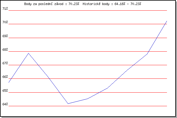 Závod| Body | Výkonnost | Změna | 11.08.2010 | Obřany, 8.8 km | 65.72% | 65.72% | | 10.08.2011 | Obřany, 8.8 km | 67.86% | 67.22% | +1.50% | 08.08.2012 | Obřany, 8.8 km | 66.12% | 66.81% | -0.41% | 17.07.2013 | Atletický stadión Pod Palackého vrche | 64.18% | 66.18% | -0.63% | 28.05.2014 | Obřany, 8.8 km | 64.54% | 65.72% | -0.46% | 01.07.2015 | Obřany, 8.8 km | 65.32% | 65.68% | -0.04% | 25.05.2016 | Obřany, 8.8 km | 66.64% | 66.05% | +0.37% | 24.05.2017 | Obřany, 8.8 km | 67.80% | 66.67% | +0.62% | 15.07.2020 | Obřany, 8.8 km | 70.23% | 67.81% | +1.14% | | |