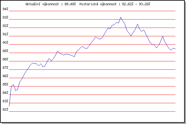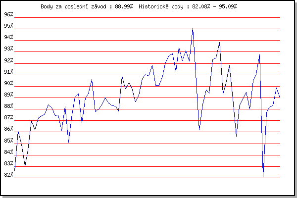 ZávodBodyVýkonnostZměna| 18.08.2010 | Moravská Slavia dráha, 10 km | 82.62% | 82.62% | | | 25.08.2010 | Líšeň Mariánské údolí, 11.1 km | 86.05% | 85.02% | +2.40% | | 08.09.2010 | Pisárky Anthropos, 6.3 km | 84.96% | 85.23% | +0.21% | | 22.09.2010 | Moravská Slavia dráha, 15 km | 83.02% | 84.50% | -0.73% | | 23.06.2011 | Palackého vrch – Běh Olympijského dne | 84.44% | 84.59% | +0.09% | | 29.06.2011 | Obřany, 8.8 km | 87.01% | 85.52% | +0.93% | | 13.07.2011 | Popůvky, 7.9 km | 86.18% | 85.88% | +0.36% | | 20.07.2011 | AC Moravská Slávia, 5km atletický o | 87.23% | 86.38% | +0.50% | | 27.07.2011 | Pisárky Anthropos, 6 km | 87.39% | 86.78% | +0.40% | | 10.08.2011 | Obřany, 8.8 km | 87.56% | 87.10% | +0.32% | | 17.08.2011 | AC Moravská Slávia, 10km atletický | 88.38% | 87.52% | +0.42% | | 24.08.2011 | Líšeň Mariánské údolí, 11.1 km | 88.14% | 87.76% | +0.24% | | 31.08.2011 | Popůvky, 7.9 km | 87.46% | 87.74% | -0.02% | | 07.09.2011 | Pisárky Anthropos, 6 km | 87.48% | 87.70% | -0.04% | | 21.09.2011 | AC Moravská Slávia Brno, 1hod atlet | 86.15% | 87.44% | -0.26% | | 28.09.2011 | Blažovice – Svatováclavský běh , 11 k | 88.22% | 87.70% | +0.26% | | 09.05.2012 | Pisárky Anthropos, 6 km | 85.11% | 87.33% | -0.37% | | 16.05.2012 | Palackého vrch, 7.1 km | 87.24% | 87.41% | +0.08% | | 23.05.2012 | Obřany, 8.8 km | 89.04% | 87.89% | +0.48% | | 30.05.2012 | Líšeň Mariánské údolí, 11 km | 89.36% | 88.35% | +0.46% | | 06.06.2012 | Popůvky, 7.9 km | 86.78% | 88.04% | -0.31% | | 13.06.2012 | Pisárky Anthropos, 6 km | 88.95% | 88.33% | +0.29% | | 20.06.2012 | Palackého vrch – Běh Olympijského dne | 89.36% | 88.67% | +0.34% | | 27.06.2012 | Obřany, 8.8 km | 90.58% | 89.24% | +0.57% | | 01.08.2012 | Palackého vrch, 7.1 km | 87.79% | 88.98% | -0.26% | | 08.08.2012 | Obřany, 8.8 km | 87.99% | 88.80% | -0.18% | | 15.08.2012 | Atletický stadión Pod Palackého vrche | 88.36% | 88.74% | -0.06% | | 22.08.2012 | Líšeň Mariánské údolí, 11 km | 88.99% | 88.85% | +0.11% | | 29.08.2012 | Pisárky Anthropos, 6 km | 88.53% | 88.82% | -0.03% | | 05.09.2012 | Popůvky, 7.9 km | 88.30% | 88.74% | -0.08% | | 12.09.2012 | Líšeň Mariánské údolí, 11 km | 88.25% | 88.65% | -0.09% | | 19.09.2012 | Atletický stadión Pod Palackého vrche | 87.84% | 88.50% | -0.15% | | 28.09.2012 | Blažovice – Svatováclavský běh, 11 km | 90.85% | 89.13% | +0.63% | | 22.05.2013 | Palackého vrch, 7.1 km | 89.77% | 89.35% | +0.22% | | 29.05.2013 | Obřany, 8.8 km | 90.28% | 89.64% | +0.29% | | 05.06.2013 | Líšeň, 11 km | 89.81% | 89.76% | +0.12% | | 03.07.2013 | Obřany, 8.8 km | 88.66% | 89.55% | -0.21% | | 10.07.2013 | Popůvky, 7.3 km | 89.20% | 89.52% | -0.03% | | 17.07.2013 | Atletický stadión Pod Palackého vrche | 90.69% | 89.86% | +0.34% | | 24.07.2013 | Pisárky Anthropos, 6 km | 91.03% | 90.21% | +0.35% | | 31.07.2013 | Palackého vrch, 7.1 km | 90.92% | 90.47% | +0.26% | | 07.08.2013 | Obřany, 8.8 km | 91.85% | 90.88% | +0.41% | | 14.08.2013 | Atletický stadión Pod Palackého vrche | 90.07% | 90.76% | -0.12% | | 04.09.2013 | Atletický stadión Pod Palackého vrche | 90.06% | 90.64% | -0.12% | | 28.09.2013 | Blažovice – Svatováclavský běh, 11 km | 90.91% | 90.74% | +0.10% | | 28.05.2014 | Obřany, 8.8 km | 92.10% | 91.11% | +0.37% | | 04.06.2014 | Líšeň, 11 km | 92.67% | 91.55% | +0.44% | | 11.06.2014 | Popůvky, 7.9 km | 92.85% | 91.96% | +0.41% | | 23.07.2014 | Pisárky Anthropos, 6 km | 91.28% | 91.87% | -0.09% | | 30.07.2014 | Palackého vrch, 7.1 km | 93.36% | 92.30% | +0.43% | | 06.08.2014 | Obřany, 8.8 km | 92.23% | 92.35% | +0.05% | | 20.08.2014 | Líšeň, 11 km | 93.11% | 92.61% | +0.26% | | 03.09.2014 | Atletický stadión Pod Palackého vrche | 92.21% | 92.57% | -0.04% | | 28.09.2014 | Blažovice – Svatováclavský běh, 11 km | 95.09% | 93.26% | +0.69% | | 20.05.2015 | Palackého vrch, 7.1 km | 91.13% | 92.86% | -0.40% | | 29.07.2015 | Palackého vrch, 7.1 km | 86.20% | 92.43% | -0.43% | | 12.08.2015 | Atletický stadión Pod Palackého vrche | 88.41% | 91.65% | -0.78% | | 19.08.2015 | Líšeň, 10.6 km | 89.71% | 91.32% | -0.33% | | 02.09.2015 | Atletický stadión Pod Palackého vrche | 89.39% | 90.99% | -0.33% | | 29.06.2016 | Obřany, 8.8 km | 92.32% | 91.43% | +0.44% | | 13.07.2016 | Atletický stadión Pod Palackého vrche | 92.49% | 91.80% | +0.37% | | 20.07.2016 | Pisárky Anthropos, 6 km | 93.83% | 92.43% | +0.63% | | 10.08.2016 | Hotel Myslivna, 7 km | 89.34% | 91.83% | -0.60% | | 17.08.2016 | Líšeň, 11 km | 90.24% | 91.55% | -0.28% | | 31.05.2017 | Líšeň, 11 km | 91.81% | 91.73% | +0.18% | | 12.07.2017 | Atletický stadión Pod Palackého vrche | 88.90% | 91.23% | -0.50% | | 25.07.2018 | Líšeň, 11 km | 85.61% | 90.70% | -0.53% | | 22.08.2018 | Palackého vrch, 7.1 km | 88.28% | 90.26% | -0.44% | | 29.08.2018 | Atletický stadión Pod Palackého vrche | 88.93% | 90.02% | -0.24% | | 05.09.2018 | Obřany, 8.8 km | 89.47% | 89.97% | -0.05% | | 05.06.2019 | Palackého vrch, 7.1 km | 87.99% | 89.60% | -0.37% | | 15.07.2020 | Obřany, 8.8 km | 90.46% | 89.90% | +0.30% | | 19.08.2020 | Obřany, 8.8 km | 91.07% | 90.28% | +0.38% | | 26.08.2020 | Atletický stadión Pod Palackého vrche | 92.74% | 91.00% | +0.72% | | 02.09.2020 | Líšeň, 11 km | 82.08% | 90.32% | -0.68% | | 23.06.2021 | Obřany | 87.76% | 89.89% | -0.43% | | 07.07.2021 | Pisárky | 88.16% | 89.57% | -0.32% | | 21.07.2021 | Obřany | 88.35% | 89.35% | -0.22% | | 04.08.2021 | Pisárky | 89.86% | 89.56% | +0.21% | | 25.08.2021 | Líšeň | 88.99% | 89.49% | -0.07% | | | | |