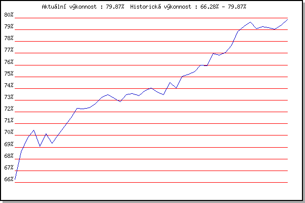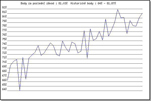ZávodBodyVýkonnostZměna| 08.09.2010 | Pisárky Anthropos, 6.3 km | 66.28% | 66.28% | | | 15.05.2013 | Pisárky Anthropos, 6 km | 69.59% | 68.59% | +2.31% | | 22.05.2013 | Palackého vrch, 7.1 km | 70.51% | 69.81% | +1.22% | | 29.05.2013 | Obřany, 8.8 km | 70.88% | 70.45% | +0.64% | | 12.06.2013 | Popůvky, 7.3 km | 64.00% | 69.05% | -1.40% | | 19.06.2013 | Pisárky Anthropos, 6 km | 71.33% | 70.16% | +1.11% | | 11.06.2014 | Popůvky, 7.9 km | 66.57% | 69.32% | -0.84% | | 18.06.2014 | Pisárky Anthropos, 6 km | 71.19% | 70.05% | +0.73% | | 02.07.2014 | Obřany, 8.8 km | 71.91% | 70.79% | +0.74% | | 09.07.2014 | Popůvky, 7.9 km | 72.50% | 71.50% | +0.71% | | 16.07.2014 | Atletický stadión Pod Palackého vrche | 73.92% | 72.32% | +0.82% | | 30.07.2014 | Palackého vrch, 7.1 km | 71.78% | 72.26% | -0.06% | | 13.05.2015 | Pisárky Anthropos, 6 km | 72.36% | 72.35% | +0.09% | | 20.05.2015 | Palackého vrch, 7.1 km | 73.41% | 72.69% | +0.34% | | 27.05.2015 | Obřany, 8.8 km | 74.56% | 73.24% | +0.55% | | 20.07.2016 | Pisárky Anthropos, 6 km | 73.91% | 73.48% | +0.24% | | 27.07.2016 | Palackého vrch, 7.1 km | 71.98% | 73.19% | -0.29% | | 10.08.2016 | Hotel Myslivna, 7 km | 71.65% | 72.89% | -0.30% | | 26.04.2017 | Pisárky Anthropos, 6 km | 74.93% | 73.48% | +0.59% | | 03.05.2017 | Hotel Myslivna, 7 km | 73.50% | 73.57% | +0.09% | | 10.05.2017 | Popůvky, 7.9 km | 72.54% | 73.40% | -0.17% | | 25.04.2018 | Atletický stadión Pod Palackého vrche | 74.70% | 73.80% | +0.40% | | 30.05.2018 | Líšeň, 11 km | 74.37% | 74.02% | +0.22% | | 13.06.2018 | Atletický stadión Pod Palackého vrche | 72.31% | 73.68% | -0.34% | | 20.06.2018 | Palackého vrch, 7.1 km | 72.64% | 73.49% | -0.19% | | 11.07.2018 | Hotel Myslivna, 7 km | 77.24% | 74.51% | +1.02% | | 18.07.2018 | Obřany, 8.8 km | 71.19% | 74.02% | -0.49% | | 25.07.2018 | Líšeň, 11 km | 77.59% | 75.05% | +1.03% | | 01.08.2018 | Pisárky Anthropos, 6 km | 75.11% | 75.21% | +0.16% | | 08.08.2018 | Hotel Myslivna, 7 km | 75.45% | 75.41% | +0.20% | | 05.06.2019 | Palackého vrch, 7.1 km | 77.07% | 75.96% | +0.55% | | 19.06.2019 | Atletický stadión Pod Palackého vrche | 75.19% | 75.92% | -0.04% | | 26.06.2019 | Pisárky Anthropos, 6 km | 79.77% | 76.98% | +1.06% | | 03.07.2019 | Obřany, 8.8 km | 76.01% | 76.84% | -0.14% | | 17.07.2019 | Palackého vrch, 7.1 km | 77.46% | 77.08% | +0.24% | | 24.07.2019 | Líšeň, 11 km | 79.05% | 77.67% | +0.59% | | 01.07.2020 | Atletický stadión Pod Palackého vrche | 81.87% | 78.85% | +1.18% | | 15.07.2020 | Obřany, 8.8 km | 80.03% | 79.31% | +0.46% | | 22.07.2020 | Kociánka, 2.7 km | 80.12% | 79.67% | +0.36% | | 29.07.2020 | Hotel Myslivna, 7 km | 76.57% | 79.07% | -0.60% | | 05.08.2020 | Popůvky, 7.9 km | 79.45% | 79.28% | +0.21% | | 12.08.2020 | Palackého vrch, 7.1 km | 78.34% | 79.18% | -0.10% | | 26.08.2020 | Atletický stadión Pod Palackého vrche | 78.20% | 79.06% | -0.12% | | 02.09.2020 | Líšeň, 11 km | 80.11% | 79.40% | +0.34% | | 25.08.2021 | Líšeň | 81.03% | 79.87% | +0.47% | | | | |