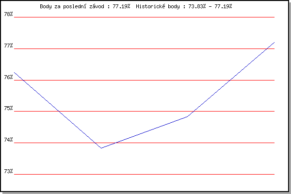 Závod| Body | Výkonnost | Změna | 28.09.2008 | Blažovice Svatováclavský běh, 11 km | 76.24% | 76.24% | | 28.09.2010 | Blažovice Svatováclavský běh, 9.4 km | 73.83% | 75.18% | -1.06% | 28.09.2011 | Blažovice – Svatováclavský běh , 11 k | 74.84% | 75.14% | -0.04% | 28.09.2012 | Blažovice – Svatováclavský běh, 11 km | 77.19% | 76.12% | +0.98% | | |
