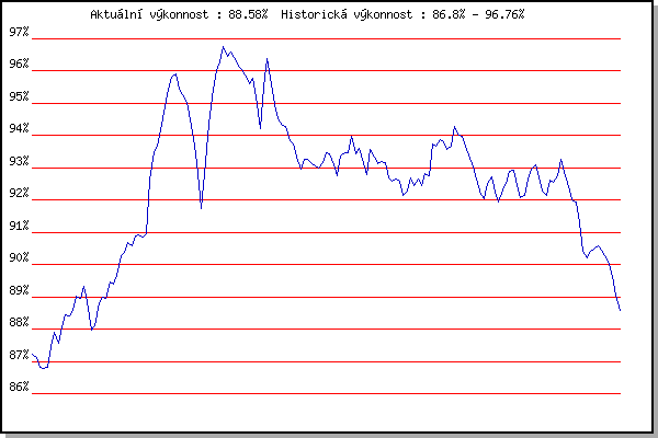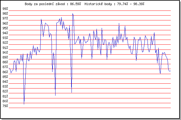 ZávodBodyVýkonnostZměna| 31.05.2006 | Palackého vrch vodárna, 9 km | 87.22% | 87.22% | | | 07.06.2006 | Líšeň Mariánské údolí, 11.1 km | 86.97% | 87.11% | -0.11% | | 16.05.2007 | Pisárky Anthropos, 6.6 km | 86.14% | 86.83% | -0.28% | | 23.05.2007 | Obřany, 8.8 km | 86.61% | 86.80% | -0.03% | | 30.05.2007 | Líšeň Mariánské údolí, 11.1 km | 86.77% | 86.83% | +0.03% | | 06.06.2007 | Veselka, Popůvky Vintrovna, 7.9 km | 88.66% | 87.47% | +0.64% | | 13.06.2007 | Pisárky Anthropos, 6.6 km | 88.70% | 87.91% | +0.44% | | 27.06.2007 | Obřany, 8.8 km | 86.46% | 87.58% | -0.33% | | 11.07.2007 | Veselka, Popůvky Vintrovna, 7.9 km | 89.06% | 88.07% | +0.49% | | 18.07.2007 | Moravská Slávia dráha, 15 km | 89.07% | 88.44% | +0.37% | | 25.07.2007 | Pisárky Anthropos, 6.6 km | 87.96% | 88.41% | -0.03% | | 01.08.2007 | Obřany, 8.8 km | 88.79% | 88.59% | +0.18% | | 08.08.2007 | Líšeň Mariánské údolí, 11.1 km | 89.91% | 89.01% | +0.42% | | 15.08.2007 | Moravská Slávia dráha, 10 km | 88.64% | 88.97% | -0.04% | | 22.08.2007 | Veselka, Popůvky Vintrovna, 7.9 km | 90.14% | 89.33% | +0.36% | | 09.10.2010 | Mizuno sedmička, 7 km | 79.74% | 88.84% | -0.49% | | 16.05.2012 | Palackého vrch, 7.1 km | 84.34% | 87.96% | -0.88% | | 30.05.2012 | Líšeň Mariánské údolí, 11 km | 87.82% | 88.10% | +0.14% | | 06.06.2012 | Popůvky, 7.9 km | 90.15% | 88.81% | +0.71% | | 13.06.2012 | Pisárky Anthropos, 6 km | 88.74% | 88.98% | +0.17% | | 20.06.2012 | Palackého vrch – Běh Olympijského dne | 88.61% | 88.97% | -0.01% | | 27.06.2012 | Obřany, 8.8 km | 90.67% | 89.47% | +0.50% | | 18.07.2012 | Atletický stadión Pod Palackého vrche | 88.97% | 89.41% | -0.06% | | 25.07.2012 | Pisárky Anthropos, 6 km | 90.29% | 89.67% | +0.26% | | 01.08.2012 | Palackého vrch, 7.1 km | 91.82% | 90.27% | +0.60% | | 08.08.2012 | Obřany, 8.8 km | 90.42% | 90.39% | +0.12% | | 15.08.2012 | Atletický stadión Pod Palackého vrche | 91.33% | 90.70% | +0.31% | | 22.08.2012 | Líšeň Mariánské údolí, 11 km | 89.88% | 90.59% | -0.11% | | 29.08.2012 | Pisárky Anthropos, 6 km | 91.52% | 90.88% | +0.29% | | 05.09.2012 | Popůvky, 7.9 km | 90.92% | 90.94% | +0.06% | | 12.09.2012 | Líšeň Mariánské údolí, 11 km | 90.45% | 90.87% | -0.07% | | 19.09.2012 | Atletický stadión Pod Palackého vrche | 91.10% | 90.97% | +0.10% | | 22.05.2013 | Palackého vrch, 7.1 km | 97.29% | 92.62% | +1.65% | | 29.05.2013 | Obřany, 8.8 km | 95.64% | 93.49% | +0.87% | | 05.06.2013 | Líšeň, 11 km | 93.63% | 93.67% | +0.18% | | 12.06.2013 | Popůvky, 7.3 km | 95.08% | 94.18% | +0.51% | | 19.06.2013 | Pisárky Anthropos, 6 km | 96.46% | 94.91% | +0.73% | | 26.06.2013 | Palackého vrch – Běh Olympijského dne | 96.29% | 95.45% | +0.54% | | 03.07.2013 | Obřany, 8.8 km | 96.07% | 95.80% | +0.35% | | 10.07.2013 | Popůvky, 7.3 km | 95.75% | 95.91% | +0.11% | | 24.07.2013 | Pisárky Anthropos, 6 km | 93.50% | 95.44% | -0.47% | | 31.07.2013 | Palackého vrch, 7.1 km | 94.32% | 95.26% | -0.18% | | 07.08.2013 | Obřany, 8.8 km | 94.05% | 95.04% | -0.22% | | 14.08.2013 | Atletický stadión Pod Palackého vrche | 86.38% | 94.49% | -0.55% | | 21.08.2013 | Líšeň, 11 km | 90.37% | 93.70% | -0.79% | | 04.09.2013 | Atletický stadión Pod Palackého vrche | 88.91% | 92.81% | -0.89% | | 11.09.2013 | Líšeň, 11 km | 81.54% | 91.73% | -1.08% | | 18.09.2013 | Pisárky Anthropos, 6 km | 96.46% | 93.19% | +1.46% | | 14.05.2014 | Pisárky Anthropos, 6 km | 96.55% | 94.35% | +1.16% | | 21.05.2014 | Palackého vrch, 7.1 km | 96.66% | 95.19% | +0.84% | | 28.05.2014 | Obřany, 8.8 km | 97.34% | 96.02% | +0.83% | | 04.06.2014 | Líšeň, 11 km | 95.96% | 96.28% | +0.26% | | 11.06.2014 | Popůvky, 7.9 km | 97.65% | 96.76% | +0.48% | | 18.06.2014 | Pisárky Anthropos, 6 km | 95.14% | 96.45% | -0.31% | | 25.06.2014 | Palackého vrch – Běh Olympijského dne | 96.79% | 96.60% | +0.15% | | 02.07.2014 | Obřany, 8.8 km | 95.60% | 96.43% | -0.17% | | 09.07.2014 | Popůvky, 7.9 km | 94.93% | 96.15% | -0.28% | | 16.07.2014 | Atletický stadión Pod Palackého vrche | 95.51% | 96.05% | -0.10% | | 30.07.2014 | Palackého vrch, 7.1 km | 95.15% | 95.87% | -0.18% | | 06.08.2014 | Obřany, 8.8 km | 93.08% | 95.60% | -0.27% | | 13.08.2014 | Atletický stadión Pod Palackého vrche | 95.93% | 95.79% | +0.19% | | 20.08.2014 | Líšeň, 11 km | 90.57% | 95.20% | -0.59% | | 03.09.2014 | Atletický stadión Pod Palackého vrche | 82.13% | 94.21% | -0.99% | | 10.09.2014 | Líšeň, 11 km | 98.39% | 95.51% | +1.30% | | 17.09.2014 | Pisárky Anthropos, 6 km | 98.00% | 96.38% | +0.87% | | 13.05.2015 | Pisárky Anthropos, 6 km | 92.16% | 95.61% | -0.77% | | 20.05.2015 | Palackého vrch, 7.1 km | 92.25% | 94.96% | -0.65% | | 27.05.2015 | Obřany, 8.8 km | 92.66% | 94.53% | -0.43% | | 03.06.2015 | Líšeň, 11 km | 93.17% | 94.30% | -0.23% | | 10.06.2015 | Popůvky, 7.9 km | 93.74% | 94.27% | -0.03% | | 17.06.2015 | Pisárky Anthropos, 6 km | 92.14% | 93.85% | -0.42% | | 24.06.2015 | Palackého vrch, 7.1 km | 93.13% | 93.75% | -0.10% | | 15.07.2015 | Atletický stadión Pod Palackého vrche | 89.17% | 93.32% | -0.43% | | 22.07.2015 | Pisárky Anthropos, 6 km | 91.26% | 92.97% | -0.35% | | 29.07.2015 | Palackého vrch, 7.1 km | 93.78% | 93.26% | +0.29% | | 05.08.2015 | Obřany, 8.8 km | 92.88% | 93.26% | 0.00% | | 12.08.2015 | Atletický stadión Pod Palackého vrche | 92.32% | 93.13% | -0.13% | | 19.08.2015 | Líšeň, 10.6 km | 92.65% | 93.06% | -0.07% | | 26.08.2015 | Popůvky, 7.9 km | 92.61% | 92.99% | -0.07% | | 02.09.2015 | Atletický stadión Pod Palackého vrche | 93.49% | 93.15% | +0.16% | | 20.04.2016 | Atletický stadión Pod Palackého vrche | 94.32% | 93.48% | +0.33% | | 27.04.2016 | Pisárky Anthropos, 6 km | 93.14% | 93.44% | -0.04% | | 04.05.2016 | Líšeň, 11 km | 89.05% | 93.09% | -0.35% | | 11.05.2016 | Popůvky, 7.9 km | 91.18% | 92.76% | -0.33% | | 18.05.2016 | Palackého vrch, 7.1 km | 94.89% | 93.38% | +0.62% | | 25.05.2016 | Obřa