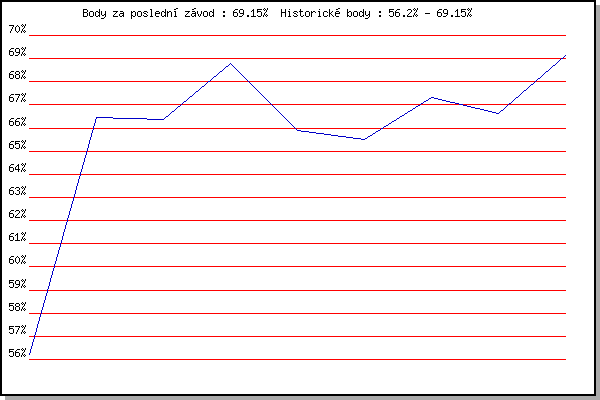 ZávodBodyVýkonnostZměna| 17.05.2006 | Pisárky Anthropos, 6.6 km | 56.20% | 56.20% | | | 12.05.2010 | Pisárky Anthropos, 6.3 km | 66.45% | 63.49% | +7.29% | | 26.05.2010 | Obřany, 8.8 km | 66.35% | 65.66% | +2.17% | | 02.06.2010 | Líšeň Mariánské údolí, 11.1 km | 68.78% | 67.42% | +1.76% | | 09.06.2010 | Veselka, Popůvky Vintrovna, 7.9 km | 65.90% | 66.98% | -0.44% | | 23.06.2010 | Palackého vrch Běh Olympijského dne | 65.52% | 66.61% | -0.37% | | 28.07.2010 | Pisárky Anthropos, 6.3 km | 67.31% | 66.90% | +0.29% | | 04.08.2010 | Palackého vrch , 7.1 km | 66.64% | 66.91% | +0.01% | | 11.08.2010 | Obřany, 8.8 km | 69.15% | 67.62% | +0.71% | | | | |
