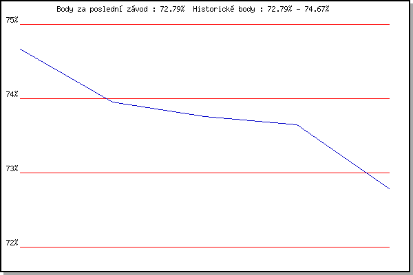 Závod| Body | Výkonnost | Změna | 27.06.2007 | Obřany, 8.8 km | 74.67% | 74.67% | | 11.07.2007 | Veselka, Popůvky Vintrovna, 7.9 km | 73.95% | 74.35% | -0.32% | 28.09.2007 | Blažovice Svatováclavský běh, 11 km | 73.76% | 74.14% | -0.21% | 28.09.2009 | Blažovice Svatováclavský běh, 11 km | 73.65% | 73.99% | -0.15% | 02.06.2010 | Líšeň Mariánské údolí, 11.1 km | 72.79% | 73.79% | -0.20% | | |