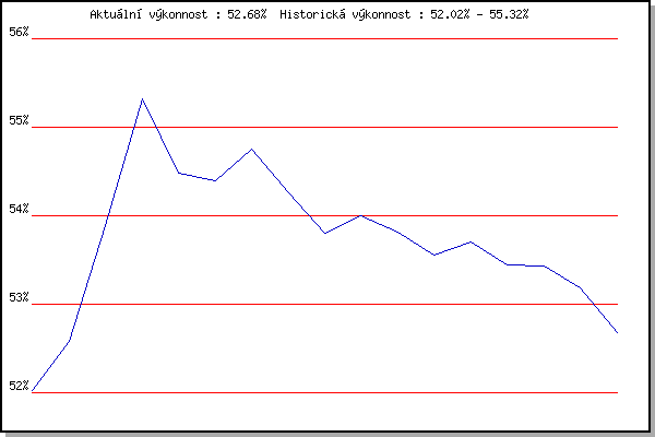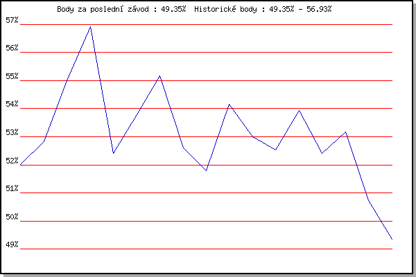 ZávodBodyVýkonnostZměna| 20.04.2016 | Atletický stadión Pod Palackého vrche | 52.02% | 52.02% | | | 27.04.2016 | Pisárky Anthropos, 6 km | 52.83% | 52.58% | +0.56% | | 04.05.2016 | Líšeň, 11 km | 54.99% | 53.89% | +1.31% | | 11.05.2016 | Popůvky, 7.9 km | 56.93% | 55.32% | +1.43% | | 18.05.2016 | Palackého vrch, 7.1 km | 52.41% | 54.48% | -0.84% | | 25.05.2016 | Obřany, 8.8 km | 53.78% | 54.39% | -0.09% | | 01.06.2016 | Líšeň, 11 km | 55.17% | 54.75% | +0.36% | | 08.06.2016 | Popůvky, 7.9 km | 52.61% | 54.26% | -0.49% | | 22.06.2016 | Palackého vrch Běh Olympijského dne | 51.80% | 53.80% | -0.46% | | 13.07.2016 | Atletický stadión Pod Palackého vrche | 54.16% | 54.00% | +0.20% | | 03.08.2016 | Obřany, 8.8 km | 53.00% | 53.82% | -0.18% | | 10.08.2016 | Hotel Myslivna, 7 km | 52.54% | 53.55% | -0.27% | | 17.08.2016 | Líšeň, 11 km | 53.94% | 53.70% | +0.15% | | 31.08.2016 | Atletický stadión Pod Palackého vrche | 52.41% | 53.45% | -0.25% | | 07.09.2016 | Pisárky Anthropos, 6 km | 53.18% | 53.43% | -0.02% | | 03.05.2017 | Hotel Myslivna, 7 km | 50.73% | 53.18% | -0.25% | | 17.05.2017 | Palackého vrch, 7.1 km | 49.35% | 52.68% | -0.50% | | | | |