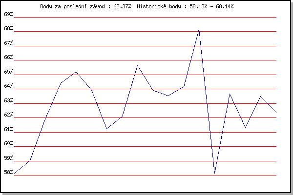 ZávodBodyVýkonnostZměna| 27.04.2016 | Pisárky Anthropos, 6 km | 58.14% | 58.14% | | | 11.05.2016 | Popůvky, 7.9 km | 59.01% | 58.75% | +0.61% | | 18.05.2016 | Palackého vrch, 7.1 km | 61.89% | 60.44% | +1.69% | | 25.05.2016 | Obřany, 8.8 km | 64.41% | 62.31% | +1.87% | | 01.06.2016 | Líšeň, 11 km | 65.18% | 63.62% | +1.31% | | 08.06.2016 | Popůvky, 7.9 km | 63.94% | 64.03% | +0.41% | | 22.06.2016 | Palackého vrch Běh Olympijského dne | 61.23% | 63.33% | -0.70% | | 29.06.2016 | Obřany, 8.8 km | 62.12% | 63.10% | -0.23% | | 20.07.2016 | Pisárky Anthropos, 6 km | 65.64% | 63.95% | +0.85% | | 27.07.2016 | Palackého vrch, 7.1 km | 63.91% | 64.07% | +0.12% | | 31.08.2016 | Atletický stadión Pod Palackého vrche | 63.53% | 64.03% | -0.04% | | 07.09.2016 | Pisárky Anthropos, 6 km | 64.18% | 64.17% | +0.14% | | 26.04.2017 | Pisárky Anthropos, 6 km | 68.14% | 65.31% | +1.14% | | 10.05.2017 | Popůvky, 7.9 km | 58.13% | 64.49% | -0.82% | | 17.05.2017 | Palackého vrch, 7.1 km | 63.66% | 64.53% | +0.04% | | 31.05.2017 | Líšeň, 11 km | 61.34% | 63.88% | -0.65% | | 07.06.2017 | Pisárky Anthropos, 6 km | 63.51% | 63.92% | +0.04% | | 14.06.2017 | Popůvky, 7.9 km | 62.37% | 63.66% | -0.26% | | | | |