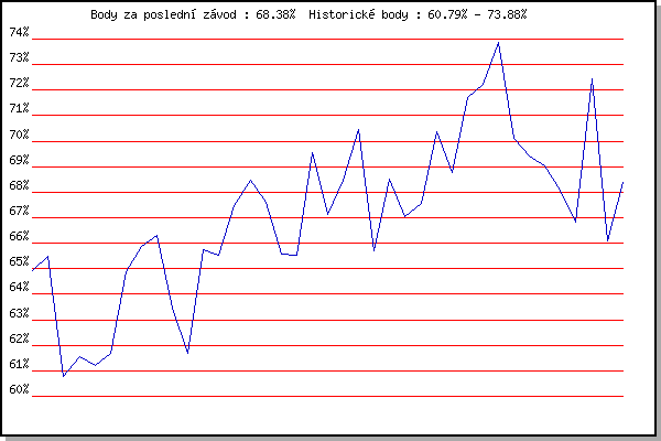 ZávodBodyVýkonnostZměna| 20.04.2016 | Atletický stadión Pod Palackého vrche | 64.92% | 64.92% | | | 27.04.2016 | Pisárky Anthropos, 6 km | 65.49% | 65.31% | +0.39% | | 25.05.2016 | Obřany, 8.8 km | 60.79% | 64.10% | -1.21% | | 08.06.2016 | Popůvky, 7.9 km | 61.55% | 63.31% | -0.79% | | 22.06.2016 | Palackého vrch Běh Olympijského dne | 61.20% | 62.71% | -0.60% | | 29.06.2016 | Obřany, 8.8 km | 61.70% | 62.47% | -0.24% | | 13.07.2016 | Atletický stadión Pod Palackého vrche | 64.90% | 63.33% | +0.86% | | 20.07.2016 | Pisárky Anthropos, 6 km | 65.87% | 64.23% | +0.90% | | 03.08.2016 | Obřany, 8.8 km | 66.32% | 64.98% | +0.75% | | 17.08.2016 | Líšeň, 11 km | 63.47% | 64.75% | -0.23% | | 07.09.2016 | Pisárky Anthropos, 6 km | 61.69% | 64.09% | -0.66% | | 26.04.2017 | Pisárky Anthropos, 6 km | 65.74% | 64.67% | +0.58% | | 17.05.2017 | Palackého vrch, 7.1 km | 65.52% | 65.05% | +0.38% | | 24.05.2017 | Obřany, 8.8 km | 67.48% | 65.86% | +0.81% | | 21.06.2017 | Palackého vrch, 7.1 km | 68.45% | 66.68% | +0.82% | | 26.07.2017 | Palackého vrch, 7.1 km | 67.60% | 67.05% | +0.37% | | 09.08.2017 | Hotel Myslivna, 7 km | 65.58% | 66.77% | -0.28% | | 23.08.2017 | Popůvky, 7.9 km | 65.54% | 66.52% | -0.25% | | 25.04.2018 | Atletický stadión Pod Palackého vrche | 69.55% | 67.35% | +0.83% | | 02.05.2018 | Hotel Myslivna, 7 km | 67.12% | 67.39% | +0.04% | | 16.05.2018 | Palackého vrch, 7.1 km | 68.46% | 67.75% | +0.36% | | 23.05.2018 | Obřany, 8.8 km | 70.47% | 68.55% | +0.80% | | 06.06.2018 | Pisárky Anthropos, 6 km | 65.70% | 67.99% | -0.56% | | 20.06.2018 | Palackého vrch, 7.1 km | 68.49% | 68.23% | +0.24% | | 27.06.2018 | Popůvky, 7.9 km | 67.03% | 68.05% | -0.18% | | 01.08.2018 | Pisárky Anthropos, 6 km | 67.58% | 68.05% | 0.00% | | 05.09.2018 | Obřany, 8.8 km | 70.39% | 68.71% | +0.66% | | 12.09.2018 | Pisárky Anthropos, 6 km | 68.79% | 68.81% | +0.10% | | 22.05.2019 | Obřany, 8.8 km | 71.70% | 69.63% | +0.82% | | 29.05.2019 | Líšeň, 11 km | 72.24% | 70.41% | +0.78% | | 05.06.2019 | Palackého vrch, 7.1 km | 73.88% | 71.43% | +1.02% | | 26.06.2019 | Pisárky Anthropos, 6 km | 70.13% | 71.26% | -0.17% | | 03.07.2019 | Obřany, 8.8 km | 69.40% | 70.94% | -0.32% | | 24.07.2019 | Líšeň, 11 km | 69.03% | 70.57% | -0.37% | | 14.08.2019 | Palackého vrch, 7.1 km | 68.06% | 70.13% | -0.44% | | 11.09.2019 | Pisárky Anthropos, 6 km | 66.84% | 69.64% | -0.49% | | 01.07.2020 | Atletický stadión Pod Palackého vrche | 72.43% | 70.48% | +0.84% | | 29.07.2020 | Hotel Myslivna, 7 km | 66.10% | 69.76% | -0.72% | | 09.09.2020 | Pisárky Anthropos, 6 km | 68.38% | 69.57% | -0.19% | | | | |