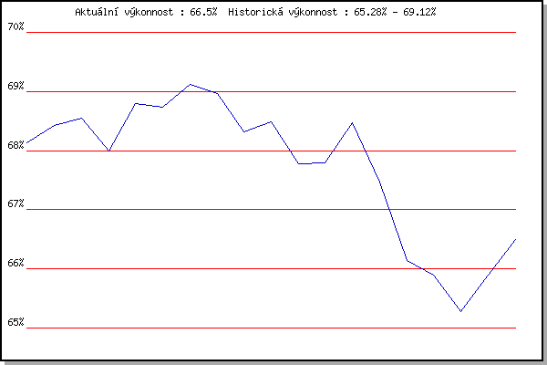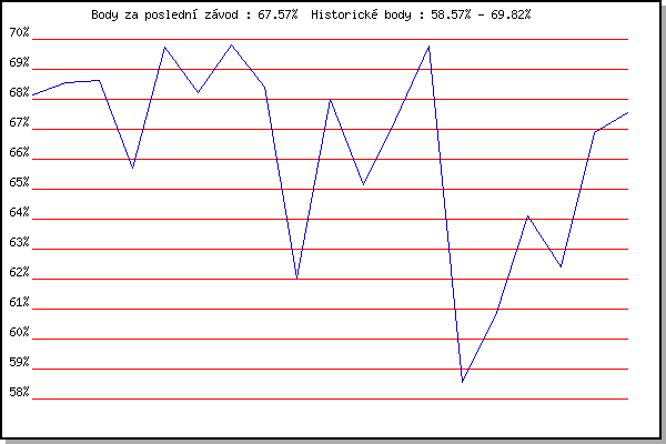 ZávodBodyVýkonnostZměna| 20.04.2016 | Atletický stadión Pod Palackého vrche | 68.14% | 68.14% | | | 27.04.2016 | Pisárky Anthropos, 6 km | 68.54% | 68.42% | +0.28% | | 04.05.2016 | Líšeň, 11 km | 68.62% | 68.55% | +0.13% | | 18.05.2016 | Palackého vrch, 7.1 km | 65.69% | 68.00% | -0.55% | | 25.05.2016 | Obřany, 8.8 km | 69.72% | 68.80% | +0.80% | | 08.06.2016 | Popůvky, 7.9 km | 68.21% | 68.73% | -0.07% | | 29.06.2016 | Obřany, 8.8 km | 69.82% | 69.12% | +0.39% | | 13.07.2016 | Atletický stadión Pod Palackého vrche | 68.41% | 68.96% | -0.16% | | 10.08.2016 | Hotel Myslivna, 7 km | 62.02% | 68.32% | -0.64% | | 17.08.2016 | Líšeň, 11 km | 68.00% | 68.48% | +0.16% | | 24.08.2016 | Popůvky, 7.9 km | 65.15% | 67.78% | -0.70% | | 31.08.2016 | Atletický stadión Pod Palackého vrche | 67.35% | 67.80% | +0.02% | | 07.09.2016 | Pisárky Anthropos, 6 km | 69.79% | 68.47% | +0.67% | | 10.05.2017 | Popůvky, 7.9 km | 58.57% | 67.47% | -1.00% | | 17.05.2017 | Palackého vrch, 7.1 km | 60.77% | 66.15% | -1.32% | | 07.06.2017 | Pisárky Anthropos, 6 km | 64.12% | 65.90% | -0.25% | | 14.06.2017 | Popůvky, 7.9 km | 62.42% | 65.28% | -0.62% | | 12.07.2017 | Atletický stadión Pod Palackého vrche | 66.88% | 65.89% | +0.61% | | 19.07.2017 | Pisárky Anthropos, 6 km | 67.57% | 66.50% | +0.61% | | | | |