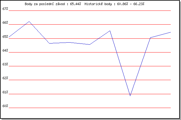 Závod| Body | Výkonnost | Změna | 20.04.2016 | Atletický stadión Pod Palackého vrche | 65.10% | 65.09% | | 04.05.2016 | Líšeň, 11 km | 66.23% | 65.89% | +0.80% | 18.05.2016 | Palackého vrch, 7.1 km | 64.64% | 65.44% | -0.45% | 25.05.2016 | Obřany, 8.8 km | 64.71% | 65.21% | -0.23% | 01.06.2016 | Líšeň, 11 km | 64.55% | 65.02% | -0.19% | 15.06.2016 | Pisárky Anthropos, 6 km | 65.55% | 65.24% | +0.22% | 13.07.2016 | Atletický stadión Pod Palackého vrche | 60.86% | 64.82% | -0.42% | 20.07.2016 | Pisárky Anthropos, 6 km | 65.05% | 65.09% | +0.27% | 03.08.2016 | Obřany, 8.8 km | 65.44% | 65.22% | +0.13% | | |