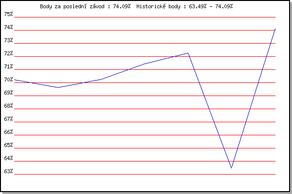 Závod| Body | Výkonnost | Změna | 11.05.2011 | Pisárky Anthropos, 6 km | 70.22% | 70.22% | | 18.05.2011 | Palackého vrch, 7.1 km | 69.63% | 69.96% | -0.26% | 01.06.2011 | Líšeň Mariánské údolí, 11.1 km | 70.27% | 70.15% | +0.19% | 09.05.2012 | Pisárky Anthropos, 6 km | 71.43% | 70.74% | +0.59% | 16.05.2012 | Palackého vrch, 7.1 km | 72.27% | 71.36% | +0.62% | 06.06.2012 | Popůvky, 7.9 km | 63.49% | 70.41% | -0.95% | 15.05.2013 | Pisárky Anthropos, 6 km | 74.09% | 72.00% | +1.59% | | |