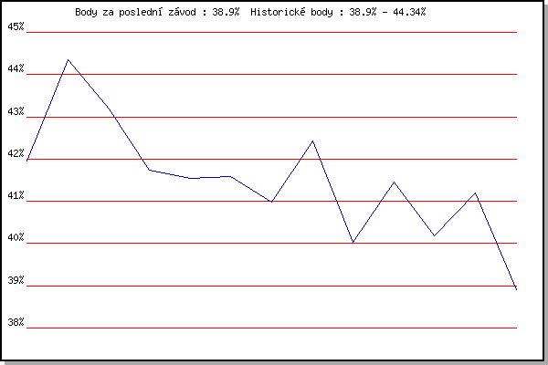 ZávodBodyVýkonnostZměna| 20.04.2016 | Atletický stadión Pod Palackého vrche | 41.95% | 41.95% | | | 18.05.2016 | Palackého vrch, 7.1 km | 44.34% | 43.62% | +1.67% | | 15.06.2016 | Pisárky Anthropos, 6 km | 43.19% | 43.58% | -0.04% | | 03.08.2016 | Obřany, 8.8 km | 41.73% | 42.99% | -0.59% | | 07.09.2016 | Pisárky Anthropos, 6 km | 41.55% | 42.60% | -0.39% | | 26.04.2017 | Pisárky Anthropos, 6 km | 41.58% | 42.33% | -0.27% | | 24.05.2017 | Obřany, 8.8 km | 40.98% | 42.10% | -0.23% | | 19.07.2017 | Pisárky Anthropos, 6 km | 42.43% | 42.26% | +0.16% | | 09.08.2017 | Hotel Myslivna, 7 km | 40.03% | 41.93% | -0.33% | | 16.08.2017 | Obřany, 8.8 km | 41.45% | 41.88% | -0.05% | | 06.09.2017 | Líšeň, 11 km | 40.18% | 41.53% | -0.35% | | 13.09.2017 | Pisárky Anthropos, 6 km | 41.20% | 41.51% | -0.02% | | 12.09.2018 | Pisárky Anthropos, 6 km | 38.90% | 41.19% | -0.32% | | | | |