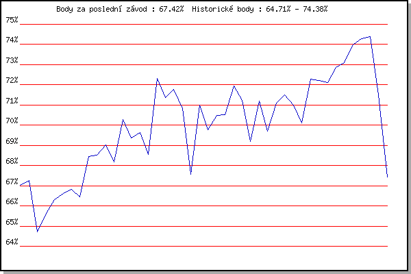 ZávodBodyVýkonnostZměna| 11.05.2011 | Pisárky Anthropos, 6 km | 67.02% | 67.01% | | | 18.05.2011 | Palackého vrch, 7.1 km | 67.25% | 67.18% | +0.17% | | 25.05.2011 | Obřany, 8.8 km | 64.71% | 66.51% | -0.67% | | 01.06.2011 | Líšeň Mariánské údolí, 11.1 km | 65.62% | 66.29% | -0.22% | | 23.06.2011 | Palackého vrch – Běh Olympijského dne | 66.32% | 66.41% | +0.12% | | 29.06.2011 | Obřany, 8.8 km | 66.63% | 66.54% | +0.13% | | 13.07.2011 | Popůvky, 7.9 km | 66.82% | 66.69% | +0.15% | | 20.07.2011 | AC Moravská Slávia, 5km atletický o | 66.43% | 66.65% | -0.04% | | 27.07.2011 | Pisárky Anthropos, 6 km | 68.46% | 67.20% | +0.55% | | 03.08.2011 | Palackého vrch, 7.1 km | 68.51% | 67.62% | +0.42% | | 10.08.2011 | Obřany, 8.8 km | 69.01% | 68.06% | +0.44% | | 17.08.2011 | AC Moravská Slávia, 10km atletický | 68.16% | 68.18% | +0.12% | | 24.08.2011 | Líšeň Mariánské údolí, 11.1 km | 70.29% | 68.82% | +0.64% | | 31.08.2011 | Popůvky, 7.9 km | 69.35% | 69.07% | +0.25% | | 14.09.2011 | Líšeň Mariánské údolí, 11.1 km | 69.62% | 69.28% | +0.21% | | 21.09.2011 | AC Moravská Slávia Brno, 1hod atlet | 68.54% | 69.15% | -0.13% | | 09.05.2012 | Pisárky Anthropos, 6 km | 72.30% | 70.01% | +0.86% | | 16.05.2012 | Palackého vrch, 7.1 km | 71.37% | 70.43% | +0.42% | | 30.05.2012 | Líšeň Mariánské údolí, 11 km | 71.77% | 70.87% | +0.44% | | 06.06.2012 | Popůvky, 7.9 km | 70.83% | 70.98% | +0.11% | | 13.06.2012 | Pisárky Anthropos, 6 km | 67.55% | 70.42% | -0.56% | | 27.06.2012 | Obřany, 8.8 km | 70.98% | 70.70% | +0.28% | | 18.07.2012 | Atletický stadión Pod Palackého vrche | 69.76% | 70.58% | -0.12% | | 25.07.2012 | Pisárky Anthropos, 6 km | 70.47% | 70.65% | +0.07% | | 01.08.2012 | Palackého vrch, 7.1 km | 70.51% | 70.67% | +0.02% | | 08.08.2012 | Obřany, 8.8 km | 71.93% | 71.04% | +0.37% | | 15.05.2013 | Pisárky Anthropos, 6 km | 71.23% | 71.15% | +0.11% | | 22.05.2013 | Palackého vrch, 7.1 km | 69.21% | 70.81% | -0.34% | | 29.05.2013 | Obřany, 8.8 km | 71.21% | 70.99% | +0.18% | | 12.06.2013 | Popůvky, 7.3 km | 69.70% | 70.75% | -0.24% | | 19.06.2013 | Pisárky Anthropos, 6 km | 71.08% | 70.88% | +0.13% | | 03.07.2013 | Obřany, 8.8 km | 71.49% | 71.09% | +0.21% | | 10.07.2013 | Popůvky, 7.3 km | 70.98% | 71.13% | +0.04% | | 17.07.2013 | Atletický stadión Pod Palackého vrche | 70.11% | 70.94% | -0.19% | | 24.07.2013 | Pisárky Anthropos, 6 km | 72.27% | 71.32% | +0.38% | | 31.07.2013 | Palackého vrch, 7.1 km | 72.21% | 71.60% | +0.28% | | 07.08.2013 | Obřany, 8.8 km | 72.10% | 71.80% | +0.20% | | 21.08.2013 | Líšeň, 11 km | 72.87% | 72.12% | +0.32% | | 28.08.2013 | Popůvky, 7.3 km | 73.10% | 72.42% | +0.30% | | 04.09.2013 | Atletický stadión Pod Palackého vrche | 73.97% | 72.88% | +0.46% | | 11.09.2013 | Líšeň, 11 km | 74.28% | 73.30% | +0.42% | | 18.09.2013 | Pisárky Anthropos, 6 km | 74.38% | 73.63% | +0.33% | | 28.09.2013 | Blažovice – Svatováclavský běh, 11 km | 71.49% | 73.23% | -0.40% | | 04.06.2014 | Líšeň, 11 km | 67.42% | 72.77% | -0.46% | | | | |