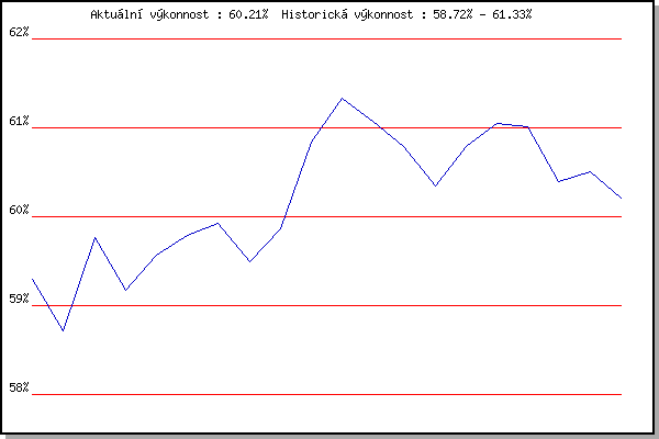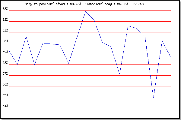 ZávodBodyVýkonnostZměna| 27.04.2016 | Pisárky Anthropos, 6 km | 59.30% | 59.30% | | | 04.05.2016 | Líšeň, 11 km | 57.99% | 58.72% | -0.58% | | 11.05.2016 | Popůvky, 7.9 km | 60.59% | 59.76% | +1.04% | | 25.05.2016 | Obřany, 8.8 km | 58.00% | 59.17% | -0.59% | | 29.06.2016 | Obřany, 8.8 km | 60.01% | 59.57% | +0.40% | | 27.07.2016 | Palackého vrch, 7.1 km | 59.91% | 59.79% | +0.22% | | 10.08.2016 | Hotel Myslivna, 7 km | 59.84% | 59.92% | +0.13% | | 17.08.2016 | Líšeň, 11 km | 58.12% | 59.50% | -0.42% | | 24.08.2016 | Popůvky, 7.9 km | 60.55% | 59.87% | +0.37% | | 26.04.2017 | Pisárky Anthropos, 6 km | 62.92% | 60.84% | +0.97% | | 03.05.2017 | Hotel Myslivna, 7 km | 62.13% | 61.33% | +0.49% | | 10.05.2017 | Popůvky, 7.9 km | 60.05% | 61.07% | -0.26% | | 17.05.2017 | Palackého vrch, 7.1 km | 59.67% | 60.79% | -0.28% | | 31.05.2017 | Líšeň, 11 km | 57.14% | 60.34% | -0.45% | | 07.06.2017 | Pisárky Anthropos, 6 km | 61.57% | 60.79% | +0.45% | | 14.06.2017 | Popůvky, 7.9 km | 61.36% | 61.05% | +0.26% | | 19.07.2017 | Pisárky Anthropos, 6 km | 60.62% | 61.01% | -0.04% | | 02.08.2017 | Líšeň, 11 km | 54.96% | 60.39% | -0.62% | | 09.08.2017 | Hotel Myslivna, 7 km | 60.18% | 60.51% | +0.12% | | 16.08.2017 | Obřany, 8.8 km | 58.73% | 60.21% | -0.30% | | | | |