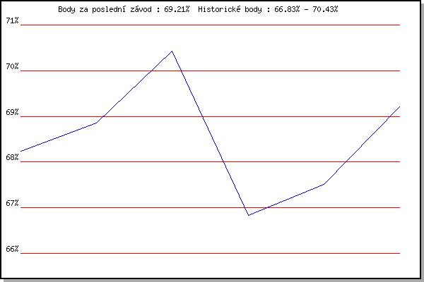 Závod| Body | Výkonnost | Změna | 04.05.2016 | Líšeň, 11 km | 68.24% | 68.23% | | 11.05.2016 | Popůvky, 7.9 km | 68.86% | 68.67% | +0.44% | 25.05.2016 | Obřany, 8.8 km | 70.43% | 69.62% | +0.95% | 01.06.2016 | Líšeň, 11 km | 66.83% | 68.92% | -0.70% | 08.06.2016 | Popůvky, 7.9 km | 67.51% | 68.56% | -0.36% | 15.06.2016 | Pisárky Anthropos, 6 km | 69.21% | 68.87% | +0.31% | | |